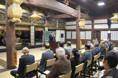 12月23日に日高別院の書院にて「御坊組組内会」が開催され、多くの御坊組寺院の僧侶、寺族が出席しました。 升巴信隆和歌山教区教務所長より、今後の日高別院の法務や運営についての説明がありました。 また、升巴教務所長による「み教えと差別の現実」についての研修講座も開催され、「隋順仏語」「順彼仏願」の視点で物事をとらえる重要性を学びました。 |