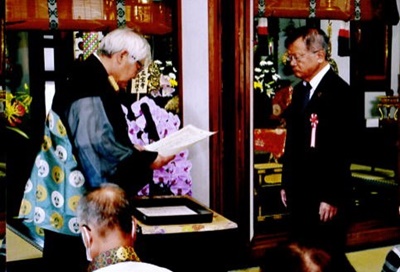 本日ここに、常徳寺本堂改修・庫裡新築落成慶讃法要をお勤めするにあたり、恭しく仏前を荘厳し、懇ろに経典を読誦して、当山門信徒並びに御坊組組長はじめ有縁の法中方御臨席のもと仏祖にその慶びをご奉告申し述べます。