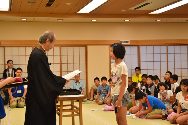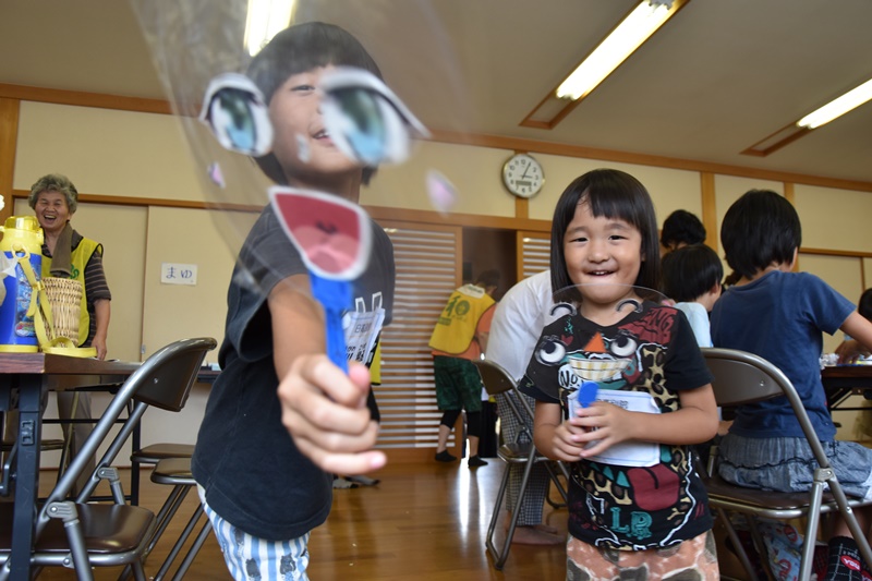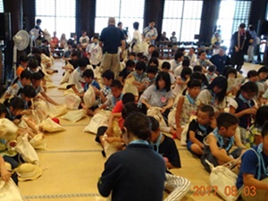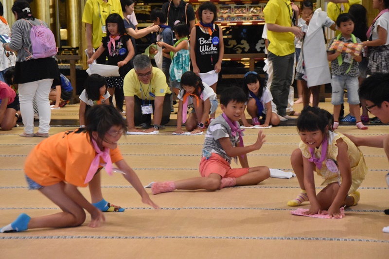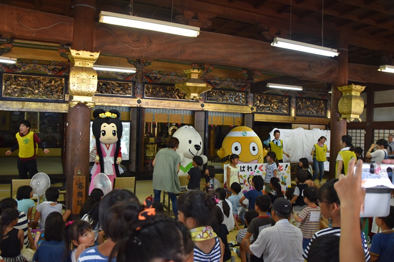 8月19日(金)、第9回御坊組キッズサンガが日高別院にて盛大に行われました。 昨年に引き続き、子どもさん160名以上が参加され、付き添いの方やスタッフを合わせると総勢300名以上の方々でお堂や境内がいっぱいになりました。 今年は「がんばれ!熊本」のメッセージも取り入れ、開式前に被災地支援メッセージボードを作ったり、第1部は、お勤め、組長さんの法話の後、みんなでくまモン体操をおこないました。その後、御堂会館では応援うちわ作り、本堂ではフェイスペイント体験、ダンボール使ったトランプタワーなどに挑戦しました。また、境内では縁日コーナーとしてクマさんかき氷やヨーヨー釣りやストラックアウトなどのアーケードゲーム、昔遊びコーナでは竹馬で遊びました。 第2部ではパネルシアターを上演したり、恒例のビンゴ大会も行い、子どもも大人も夏休みの楽しい一日となりました。 |