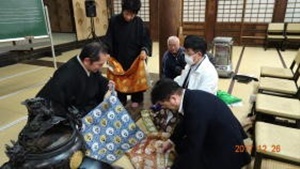 恒例となっている組の僧侶研修会と忘年会が12月26日、午後3時から日高別院と「雲水」で開催されました。 御講師は本山元式務部知堂の浄国寺住職三原義昭先生、研修テーマの被着法は五条袈裟の威儀の結び方と袴のはき方、声明は葬場勤行の添引念仏・和讃、路念仏を教えていただきました。 このうち路念仏は日頃当地では依用することが少なく、あっても御坊独特の節回しで、この日、御講師から正式な節を教えていただきとても勉強になりました。 忘年会は16名といつになく大勢の参加で和気藹々楽しいひとときを過ごしました。 |