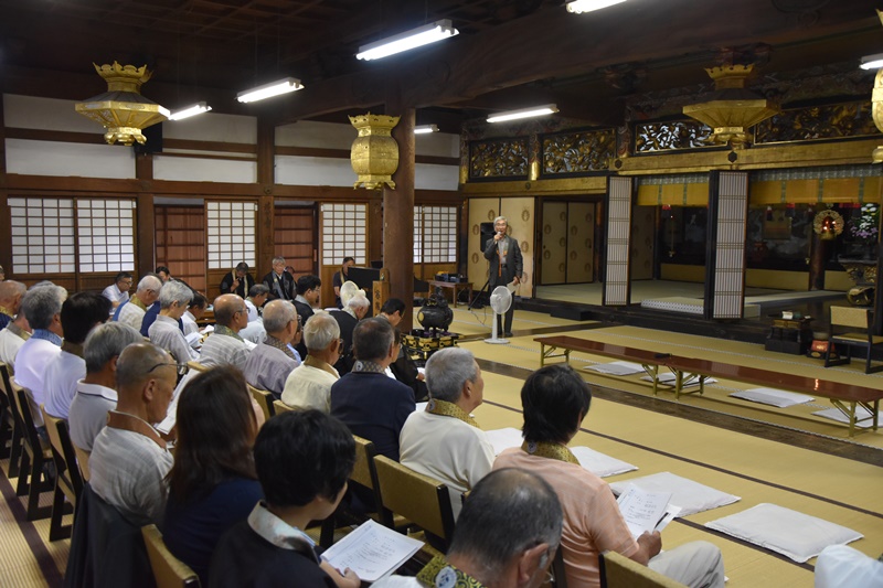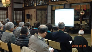 組恒例の門信徒研修会が、2月24日、日高別院を会場に65名が参加し、午後3時から開かれました。 この会は組の寺院活動支援部(部長:円満寺住職岡本眞雅紀師)の主催で、毎年2月末に開かれているものです。 今年は三宝寺住職湯川逸紀師に「石の鐘の願い 〜寺と金属類回収令〜」と題してアジア太平洋戦争時、全国の寺から強制的に供出させられた梵鐘や仏具、またその代替品について映像で報告していただきました。 いつもの研修テーマとは相当違ったものでしたが、当日の参加者にとっても「戦争」は遠いものとなっており、「へえ〜、そんなことがあったのか」と新鮮な驚きを感じて下さった方々も多かったようです。 研修会終了後は「浜の家」に場所を移して懇親会。風邪のため当日の欠席者が多く出て25名の参加にとどまったのは残念でしたが、住職と寺役員がお酒を介して本音を語り合う良い集いになりました。 |