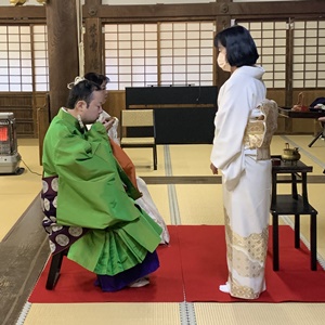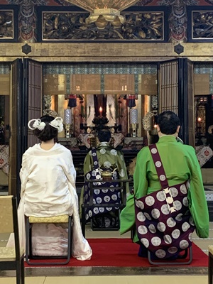 御坊組西教寺新発意の浮津真実様が、2月11日、日高別院にて仏前結婚式をあげられました。 厳粛な雰囲気の中、仏前において念珠授与、式盃などが執り行われ、 日高別院副輪番、菅原吉人師からは「親鸞聖人と恵信尼様を夫婦の手本として、楽しい時も苦しい時もお互い敬い、手を合わせ拝み合いの生活をして、念仏薫る家庭を築かれますことを願います」とお祝いの言葉を頂きました。 新婦は「慣れない雰囲気で緊張しました」と可愛らしい恥じらいを見せられ、新郎は「多くの方と仏さまに見守り頂きました。今後は二人で頑張っていきます」と決意を述べられました。 このように日高別院にて仏前結婚式をあげることができます。 是非皆さまも人生の新たな門出でご仏縁に出遇わせていただきましょう。 |