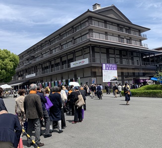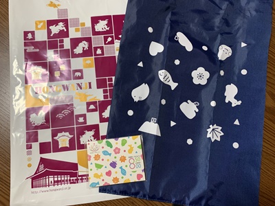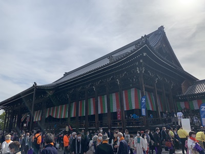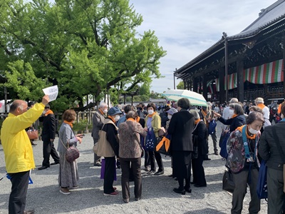 今年は宗祖親鸞聖人御誕生850年立教開宗800年ということで本山西本願寺において3月29日より5月21日まで5期にわたって慶讃法要がお勤めされております。御坊組では第3期、第4期の期間中に3班に分かれ228名で団体参拝を実施いたします。4月が終わり1班、2班の142名が参拝させていただきました。5月には3班の86名が参拝の予定です。 ここではバス1台で参加しました2班の様子をご紹介させていただきます。 2班は4月28日(金)の午後からの部にお参りいたしました。汗ばむほどの暖かな良いお天気に恵まれ朝7時過ぎから名鉄観光さんのバスで各集合場所を回り6ヶ寺のご門徒さん40名を乗せて京都に向かいました。途中の渋滞もなく予定よりも早めに、まずは滋賀追分の土産物店に立ち寄ります。 その後、五条通りを西に向かって西本願寺横の駐車場に着きました。早くも大勢の参拝者にあふれておりましたがバス内で配られた和歌山教区のカラー、オレンジ色のバンダナを皆で身に着け、係りの方の誘導で無事に誰もはぐれることなく聞法会館に移動し、中で昼食をいただきました。 昼食後は本願寺の御影堂に入り、割り当てられた席に着席します。広い堂内は満員の方で埋め尽くされ静かに始まりを待ちます。堂内には各所の柱に大きなモニターが設置されており、珍しい七具足(蝋燭立てが2対)や打敷や水引の文様についてなど慶讃法要のお荘厳やお供物についてのみどころや解説などがそのモニターに映し出されるので、後列の方にも大変見やすい工夫がなされていました。 法要の前には、今生の生を終えて向かう行き先が定まっている、安心をいただいている阿弥陀さまのはたらきについてのお話を伺いました。み教えを示し念仏に出逢わせてくださった親鸞聖人のご誕生を慶び、感謝の思いで皆で正信偈を唱和いたしました。法要後は本願寺の方が笑顔で手を振ってお見送りしてくださり本願寺を後にしました。 今回頂戴した慶讃法要の記念品は本願寺の埋木(うめき、木の割れ目を他の木材でうめる)がモチーフになった優しいデザインです。どこか近くの店先でこのエコバッグを見かける日が来るかもしれませんね。 |