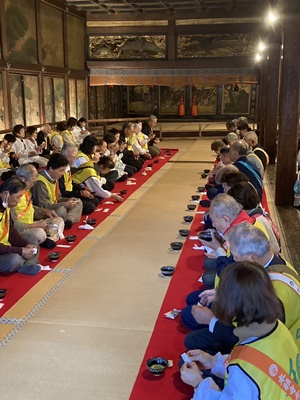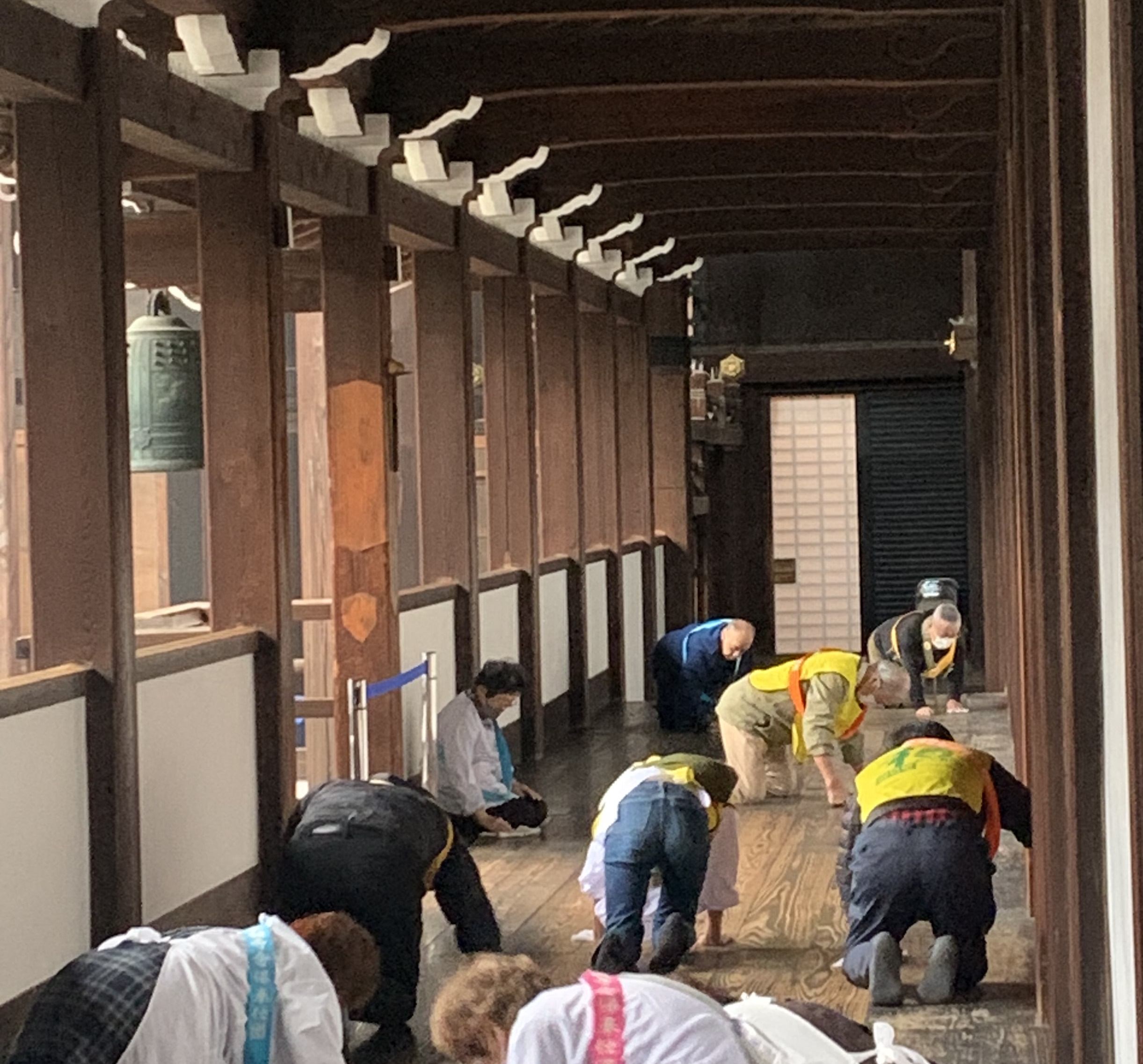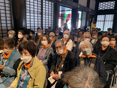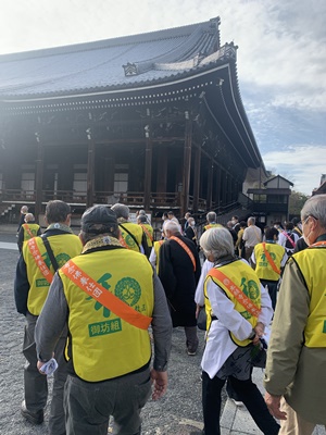 2023年も12月11日から一泊二日の日程で御坊組門徒総代会の念仏奉仕団に行ってまいりました。 参加寺院13か寺、総勢35名が参加いたしました。 当日朝、例年の冬とは違い幾分か寒さの和らいだ暖かさを感じながら、6か所の集合場所から次々とご門徒の皆さんがバスに乗り込み出発しました。途中の渋滞もなく順調に京都堀川七条の西本願寺に到着しました。 到着後は西本願寺境内の安穏殿にて昼食、オリエンテーションとなりました。今回は御坊組を含めて7団体が参加されていました。大勢の参加者でしたが、御坊組門徒総代会のメンバーは事前に配られた黄色のビブスと和歌山教区のカラーのオレンジ色の襷を付けていましたので大変目立ってわかりやすかったかと思います。オリエンテーションでの各団体の自己紹介では青木御坊組組長がお話くださいました。 阿弥陀堂に移動しての開会式後は阿弥陀堂を清掃奉仕し、その後にご門主様とのご面接、記念撮影をいたしました。その後は再び安穏殿に戻りご法話をご聴聞し初日は終了です。宿泊先の聞法会館で夕食をいただきました。 2日目の早朝は初日夜から降り出した雨の中、晨朝勤行、そしてご希望された方は帰敬式(おかみそり)を受けられました。清掃奉仕の時間になっても小雨だったため、この日は御影堂、渡り廊下、喚鐘廊下を清掃しました。雅楽の調べが聞こえる中、日ごろは立ち入ることができない喚鐘廊下を拝見でき、雨の中での清掃奉仕は大変貴重な体験となりました。 清掃奉仕の後は、通常は非公開の国宝書院鴻の間にて抹茶接待を受けました。その後閉会式までは安穏殿で休まれる方、本願寺職員の方が案内して下さる書院内などを拝観される方、御影堂での法話をご聴聞される方と様々に過ごしました。 最後は安穏殿にて閉会式。御坊組門徒総代会を代表して総代会事務局長の鶴谷さんが御染筆などの記念品を受け取られました。この後は大谷本廟に参拝、京都駅にてお土産を購入し、無事に帰途に着きました。 今回は念仏奉仕団70周年という記念の年でした。本願寺の清掃奉仕を通して親鸞聖人のみ教えを学ぶとともに、仏恩報謝の生活にいそしむことで念仏者としての自覚と意識を高める機縁とさせていただきました。 事務局の方のご尽力により早々に次回の日程が決まっております。2024年は、11月5日(月)〜6日(火)です。是非皆様もご参加いただき、ご仏縁に出逢わせていただきましょう。 |