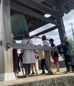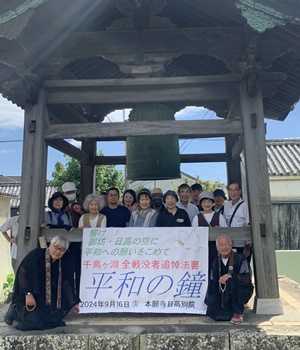 以前、雑色雑光でお話いただいた「平和の鐘」が今年も日高別院で鳴り響きました。 毎年9月18日に東京で「国立千鳥ヶ淵全戦没者追悼法要」が執り行われ、浄土真宗本願寺派が教団として恒久平和の願いを新たにするため 「平和宣言」を行い「平和の鐘」を撞きます。 全国の宗門の寺院でもその日に鐘が撞かれますが、日高別院では今年は併設の御坊幼稚園がお休みである9月16日に行われ、まだまだ暑さが残る中の秋晴れに恵まれた日に、20名を超える皆さんがお集まりくださいました。 御坊組組長のご挨拶、この取り組みを呼び掛けてくださった三宝寺ご住職からこの取り組みの由来などを伺い、その後に皆さんがおひとりおひとり大梵鐘を撞き、未来へ続く平和を願ってまいりました。 毎年この時期に日高別院にて「平和の鐘」の取り組みが行われます。どなたでも参加いただけますので、来年はより多くの方のご参加をお待ち申し上げます。 画像3枚目は戦時中に金属類回収令で供出され検査の痕が見られる日高別院の大梵鐘です。 |