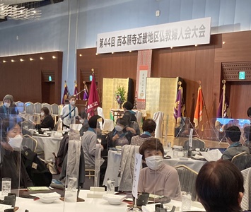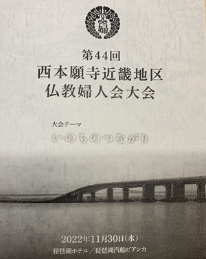 令和4年11月30日に滋賀県琵琶湖にて、第44回西本願寺近畿地区仏教婦人会大会が開催されました。コロナ禍というとこともあり、総勢280人と規模を縮小したものとなりました。 御坊組からは仏教婦人会会長谷口氏(西円寺)、副会長玉置氏(源行寺)、岡本氏(圓満寺)の計三名の方が参加されました。 琵琶湖ホテルにて午餐の後は、豪華客船の”琵琶湖汽船ビアンカ”号に乗船して、大会テーマ「いのちのつながり」を基に、滋賀教区蒲生下組願證寺ご住職の本多昌道師によるご法話をいただきました。 琵琶湖に浮かぶ有人島、沖島の楽しいお話などを賜りながら、穏やかな天候に恵まれて琵琶湖周航を楽しまれました。 |