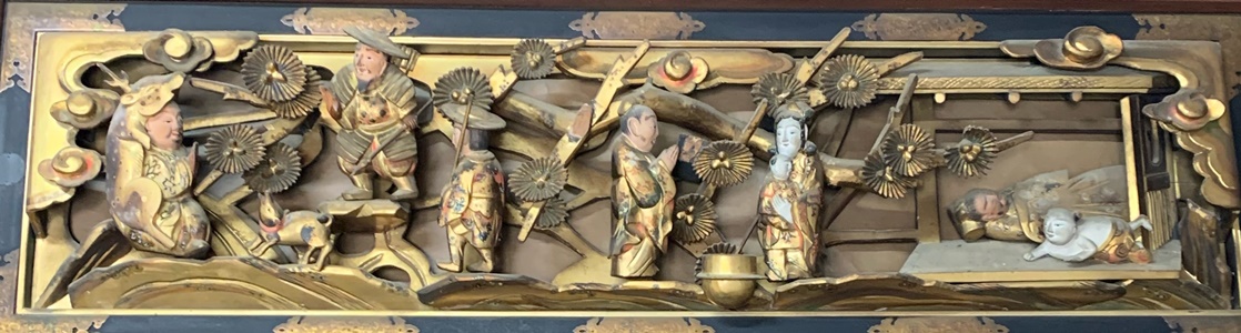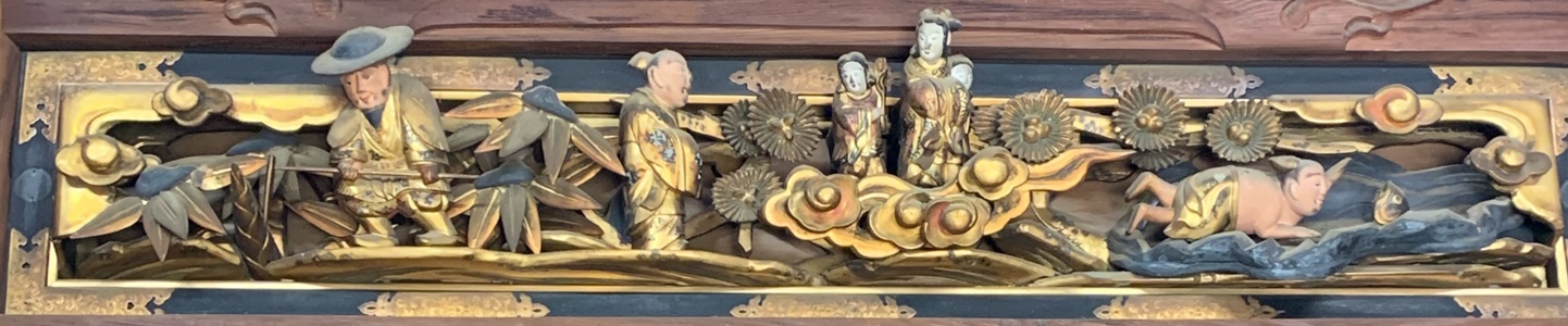文政四(一八二一)年現位置に移転再建す」とあります。又、この本堂再建について、次のような話も記されています。 「明和年間当山第六世教順、檀家某の女、幼にして不幸父母を失へるを憫み、養育の労をとる。 女、後、京都笹屋某に嫁す。夫妻並に篤信の聞あり。晩年夫を失ひ妙寿尼と號す。 宗祖、中祖、行化の旧蹟を慕ひ、諸国を巡拝す。 又、幼時の恩義を謝せんが為、当寺本堂の再建を企図し、文政四年某の工を竣へ、上棟式を行ふ。之を現今の本堂となす。」(日高郡誌より) このような小さな在所でも、長い歳月には色々なことがありました。 私が小学二年生の時、日高地方大水害(昭和二十八年七月二十八日)が起こり、本堂が避難所になりました。 暑い中、大人は復旧作業に大変だったと思いますが、子どもは夏休みで遊んでばかりでした。 以降、毎年紀伊半島をおそう台風は住民の心配事でした。 そして、長い間の願いであった庫裡と墓地の裏山の崩れを防ぐため、平成十七年、急傾斜崩壊対策工事が行われました。 これには、私も「早期実施」をお願いしに何度も役場に行ったことでした。 最近の全国各地で起こる自然災害を考える時、やってくれて良かったと思います。 あとは、本堂全体の老朽化がすすみ、改築、建立という大切な事業が私達に課せられています。 ![]() ![]() ![]() 尚、本堂の欄間には、中国における孝行(二十四考)を描いた彫刻が設けられています。 住職 川越正博