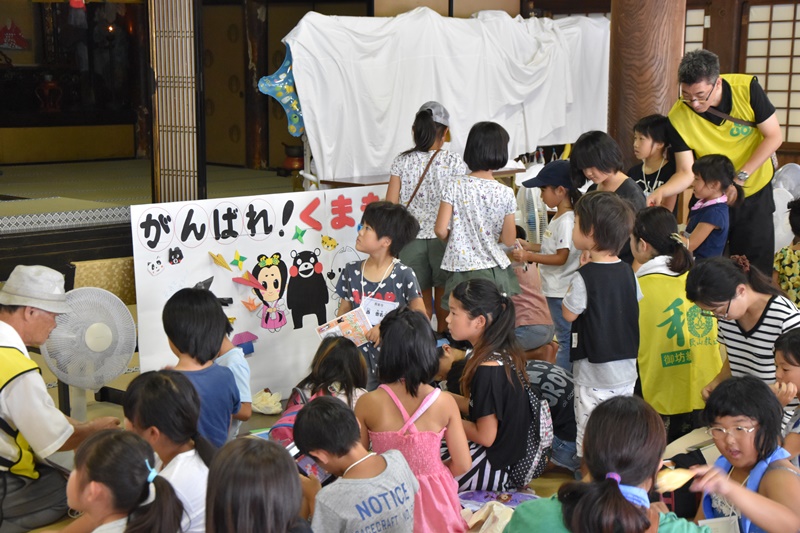 「工作の館」(御堂会館)では、透明なうちわに絵を描いたり、シールを貼ったりと、世界にひとつだけのマイうちわを作っていました。もちろん、シールには、くまモン、きいちゃん、み〜やちゃんもありましたよ。 |