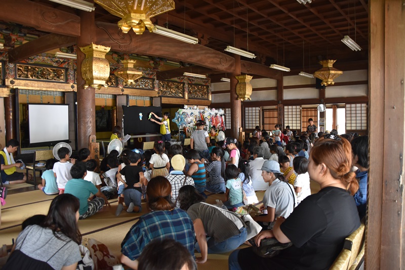 これは、パネル布を貼った舞台に、絵または文字を貼ったり外したりしながら、物語を展開していくものです。 今回は「大きな魚」という演目を上演しました。この日のために、お寺の坊守さんが念入りに練習してきました。その成果もあってか、子どもたちは食い入るように見ていました。上演が終わると子ども達からの大拍手でした。 今はやりのテレビゲームとは違い、まったくのアナログですが、人の温かさを感じるライブ感満載の上演でした。 |