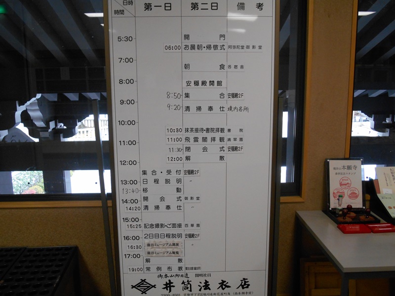 | 16時 | 明日の2日目の説明を受けてました。是非とも晨朝のお参りには参加してくださいと言われました。もちろん、参加させていただきます。 この後は、龍谷ミュージアムを見学して宿舎に戻ります。 |