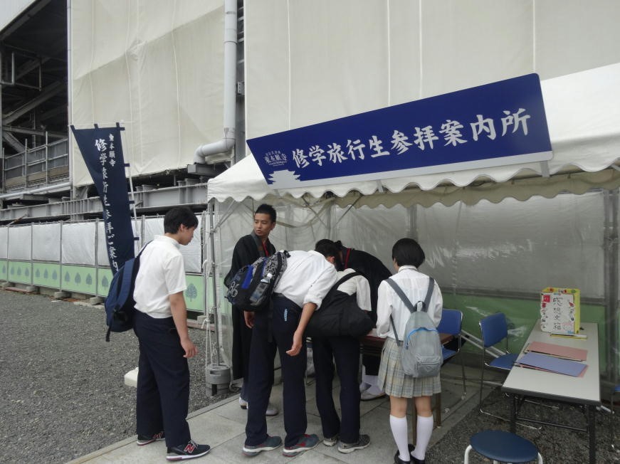 このような、説明を私が受けている間にも、受付テントにタクシーの運転手に連れられた生徒たち3グループがやってきました。そして、受付がすむと運転手さんに替わり、それぞれに若い布包・輪袈裟姿の僧侶が引率して、境内めぐりに出発してゆきました。