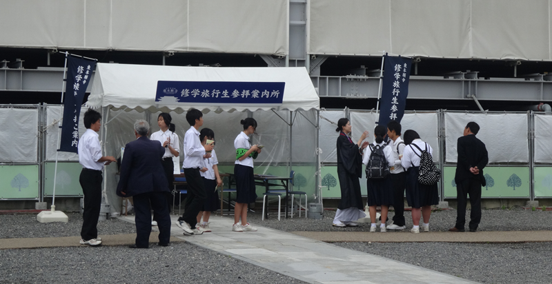 このような、説明を私が受けている間にも、受付テントにタクシーの運転手に連れられた生徒たち3グループがやってきました。そして、受付がすむと運転手さんに替わり、それぞれに若い布包・輪袈裟姿の僧侶が引率して、境内めぐりに出発してゆきました。現在、真宗大谷派青少幼年センターのHPには次のような総括が載っています。 「2014年東本願寺において開設された「修学旅行生参拝案内所」が無事終了した。30日間で332団体1805名の修学旅行生をご案内した。世界最大級の木造建築である御影堂の広さや阿弥陀堂の御修復現場に触れていただくとともに、仏法や親鸞聖人のお話を交えて真宗大谷派僧侶が案内を行った。修学旅行生の感想文には、この案内を通して仏法に出遇った感動も綴られ、この取り組みの大きな可能性が感じられた。」