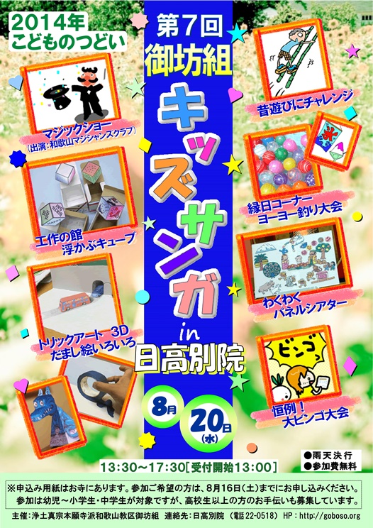 ■子ども・若者ご縁づくり本山ではこの度「子ども・若者ご縁づくり推進室」が新設されました。法統を継承されたご門主様から子どもだけではなく、若者に関してもご縁づくりの機会を増やしてもらいたいとのご要望がもとになったと聞いております。ご縁が少しでもある若者から、まったくご縁のなかった若者に関してまでもご縁づくりを行い、阿弥陀さまのお心に触れてもらえる機会を作ろうというものであります。 今年の御坊組のキッズサンガは、偶然にも、高校生や中学生のお兄さん、お姉さんもスタッフとして活躍していただきました。右下の写真は子どもたちが、お兄さん、お姉さんに教わりながらワイワイ言いながら工作を作っているところです。 短い時間ではありましたが、ご門主さまの望まれている世界が少し実現化されたのではないかと感じております。 今後も、様々な世代の方、ご縁に遇っている方、まだご縁に遇っていない方と一緒になって色んなご縁づくりの運動を模索していきたいと思っています。 なもあみだぶつ なもあみだぶつ なもあみだぶつ