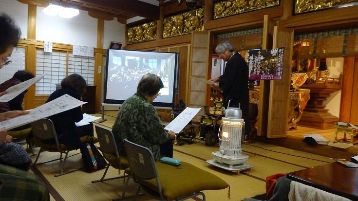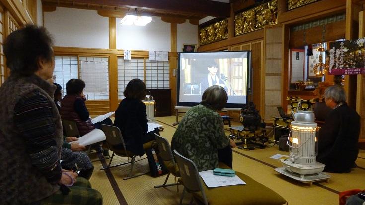 1月15日、本堂にノートパソコンを持ち込み、プロジェクターをつなげ、スピーカー代わりのカセットデッキをくっつけ、スクリーンをかけてスイッチオン。ちゃんと「逮夜法要」の開始を待つ本願寺御影堂に直結、拡大していますので映像はちょっとボケ気味ですが視聴には十分です。この日、お参りしてくださったのは常連さん8人、画面の御門主さまにあわせて合掌・礼拝。お勤めは御親修(御門主様が御導師を勤められます)の「廣文類作法」、これはちょっとなじみがありません。私はこの本山報恩講の15日の「逮夜法要」以外では聞いたことがありません。手持ちの「声明集」から経文をコピーして配布しました。「廣文類」とは「御本典・教行信証」のこと、お勤めの最初は「教行信証」の総序を音読します。