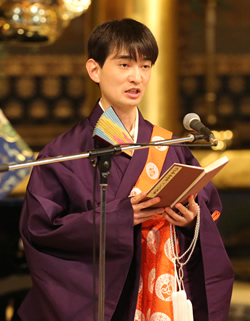 始まりました。しかし、これはイカン、難しい、難しすぎる。お参りの御同行は勿論、情けないことにプロの僧侶である私がまったくついてゆけない。「ひそかにおもんみれば、難思の弘誓は難度海を度する大船、・・・」と読み下し文ではよく親しんでいる内容ですが、漢文のままだと、経文の字を追うことさえ難しく、途中からどこを誦んでいるのかさえ見失う始末。去年も同じ状態、この年齢になると、来年もついてゆけないでしょうね。続いては「正信偈」の文類の節でのお勤め、これはイケル。いつもの寺の報恩講でのお勤めだ。住職・坊守を含め三宝寺本堂の10名がご本山御影堂満堂の御同行に加えていただいた感でした。御門徒さんには慣れない節回しではありましたが、念仏、回向も一緒にお唱えして法要は終了。 その後、「伝灯奉告法要についての消息」の発布式があり、ご門主さまが全宗門構成員に「ここに法統継承を仏祖の御前に奉告いたしますとともに、あわせて本願念仏のご法義の隆盛と宗門の充実発展とを期して、平成28年および29年に、伝灯奉告法要をお勤めすることになりました。 」と述べられました。それを受けての石上智康総長の決意をお聞きしてこの日の「本山参り」は終了。