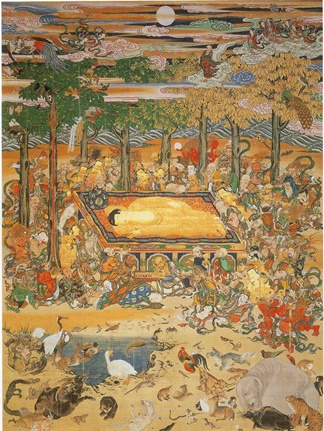 主な展示品は、親鸞聖人御真筆の墨書十字、八字名号本尊、同国宝『西方指南抄(さいほうしなんしよう)』6冊、国宝『三帖和讃』(親鸞・真仏筆)3冊、弟子にあてた聖人の御消息類、・・・高田真慧上人にあてた本願寺蓮如上人のお手紙や覚信尼公の「大谷廟堂敷地寄進状」までも展示。組長によると、毎年の高田本山の報恩講でも宝物館で少しずつ公開されるが、ここまでそろって出されるのことはないとか。一番の見応えは巨大な『涅槃図』、たて5.5メートル、近年修復なって見事な色彩で会場の天井いっぱいからつるされているが、下部はほどけきらず軸木に巻かれている。そして「一光三尊阿弥陀如来像」十数体、とにかくすごい数の至宝が展示されていました。これらの作品を見ながら独り言、『涅槃図』の前では「お釈迦様のお姿が大きすぎるじゃん」ブツブツ「蛇が人より大きいじゃん」ブツブツ「象が人より小さいじゃん」ブツブツ。何処かの放送局のカメラの餌食になっているとも知らずに・・・。