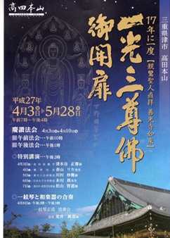 一光三尊阿弥陀如来像展示説明書を見て、高田派のお寺で所蔵する理由(上記)を知るところとなりました。ただ、現在、それが各寺本堂の「本尊」としておまつりされているかどうかはわかりません。説明板には「高田派○○寺所蔵」となっていただけです。その後、高田本山が用意して下さった無料のシャトルバス(高田学苑のスクールバス)にて一身田の専修寺に移り、本寺の秘仏「一光三尊仏」が須弥檀に安置された御影堂に参拝、写真撮影も許可されていましたので、その像容もカメラでパチリ。この日は御開扉慶讃法要中で特別講演が企画されていました。御講師は真宗大谷派僧侶川村妙慶師、易しく尊い阿弥陀さまのお心を涼やかなお声で説いてくださいました。終了後、境内をゆっくり巡ろうと思いましたが、生憎の雨、新調成った四幅の「一光三尊仏絵伝」が掛けられている如来堂だけに参拝して本山を辞しました。 |