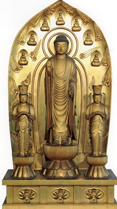 浄土真宗と浄土宗のご本尊は、ともに阿弥陀如来、だが両宗派において少しの違いがある。浄土真宗は、一向宗(一仏宗)といったくらいで、阿弥陀如来様のみ。それに対して浄土宗は、阿弥陀如来様の両脇に仏様を従えている。向かって右側が観音菩薩様、同じく左側が勢至菩薩様、この仏様のことを脇侍(きょうじ・わきじ)脇士・夾侍( きょうじ)、脇立(わきだち)と色々の呼び方をしている。中心の仏様(中尊)の教化を補佐する役割をもつとされている。浄土宗の寺院には、阿弥陀様を中尊として三体が、別々に鎮座している。この形式を阿弥陀三尊と言い、仏教における仏像安置形式の一つである。観音菩薩は阿弥陀如来の「慈悲」をあらわす化身とされ、勢至菩薩は「智慧」をあらわす化身とされる。