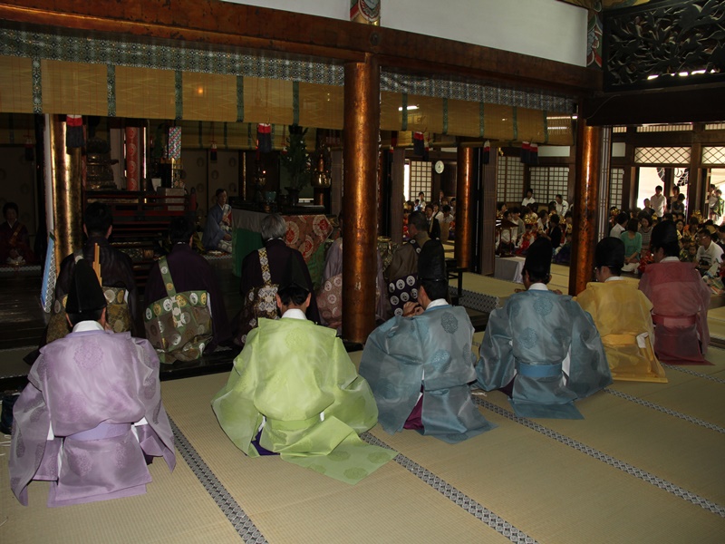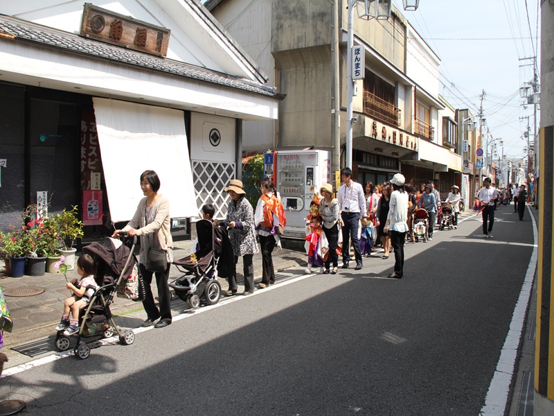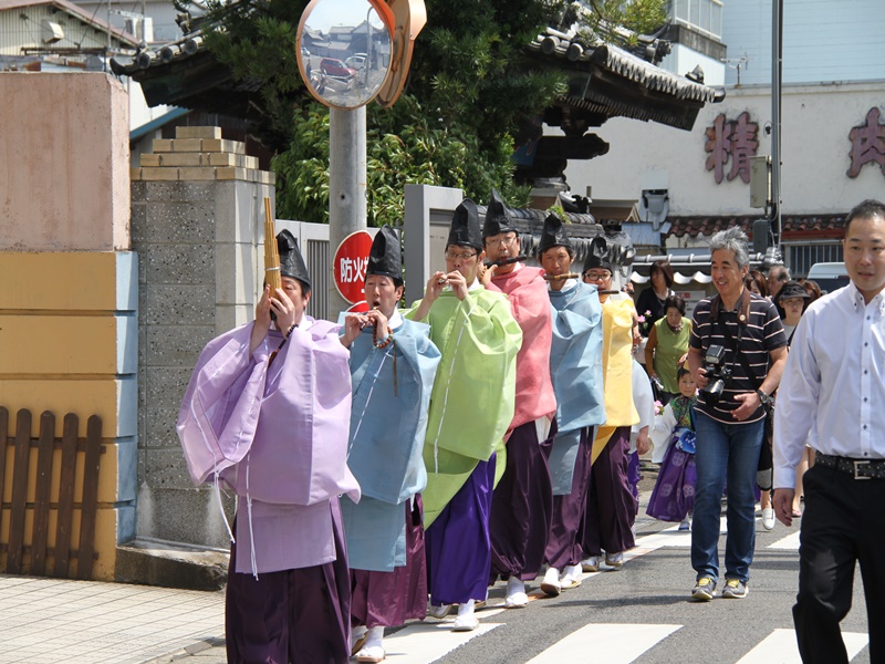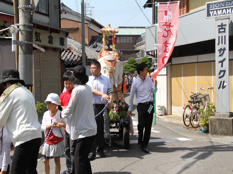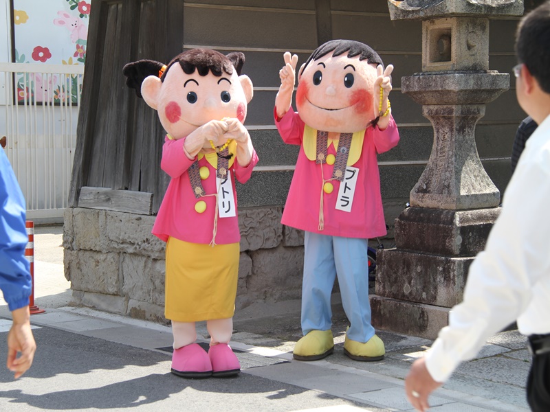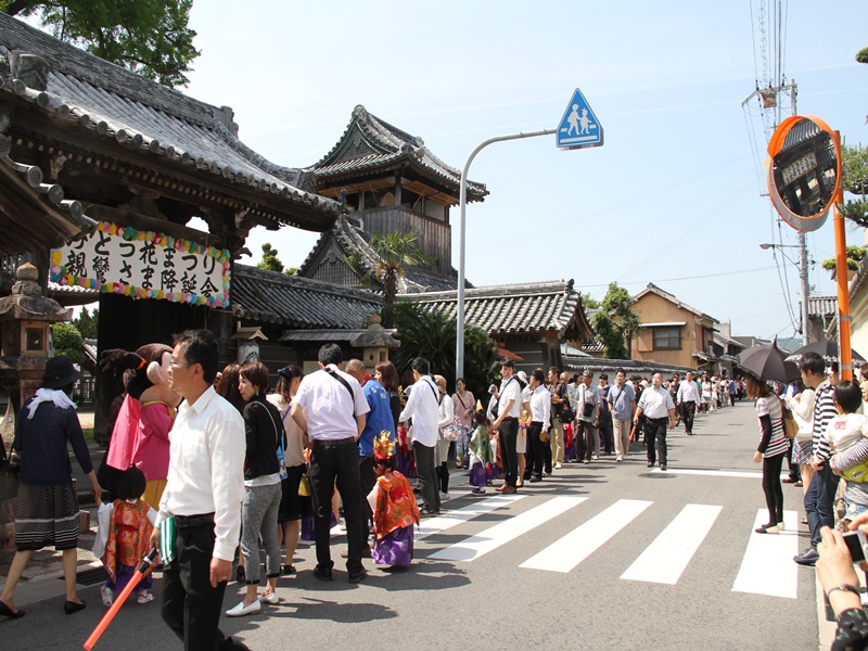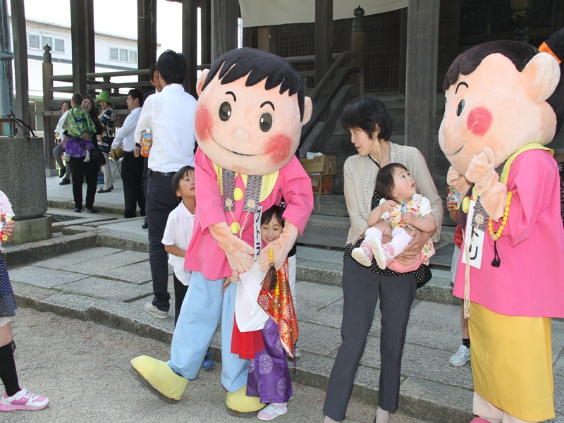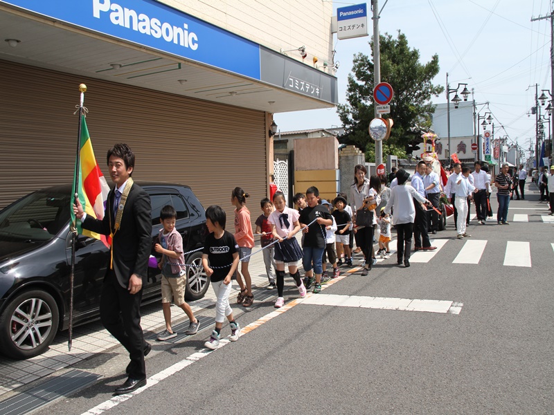 ■御坊幼稚園創立100周年の記念法要の様子 5月10日(日)、近隣の方々を含め様々な方のお力により、五月晴れの快晴の下、花まつり・降誕会・湯川忌に合わせ、御坊幼稚園創立100周年の記念法要が日高別院にて執り行われました。同園の園児を含めた88名のお稚児さんが参加された賑やかな法要となりました。午後1時の開式でしたが、開式前には既にお堂はお稚児さんとその父兄で満堂になっていました。 園児のお勤めとして「帰命無量寿如来」と歌「こどもの花まつり」「親鸞さまの誕生日」で始まり、その後、僧侶も含めてみんなで「らいはいのうた」をお勤めしました。途中、代表の園児達がお釈迦様の像に甘茶をそそいで合掌しました。 お勤めの後は、日高別院周辺の商店街を約40分かけて稚児行列のパレードです。仏旗を先頭に、白象と白象を引く子ども達、雅楽演奏団、お稚児さんと父兄、そして最後に僧侶が続きます。沿道にはパレードをみる人だかりができており、お稚児さんに向かってにこやかに手を振ると、お稚児さんも一生懸命に手を振って答えていました。暑かったせいか、中には、ご機嫌ななめで、泣きじゃくっていたお稚児さんもいました。 パレードが終わり日高別院に戻ってくると、正門の前ではプトリとプトラが出迎えてくれていました。それを見たお稚児さんは、大はしゃぎです。最後に、みんなで本堂の阿弥陀さまに向かい合掌礼拝して閉式です。その後、その場に残って、お釈迦様の像に甘茶をそそいだり、プトリとプトラに抱き着いたり、記念写真を撮ったりしてすごしました。まさに御坊幼稚園創立100周年を記念する素晴らしい法要となりました。 |