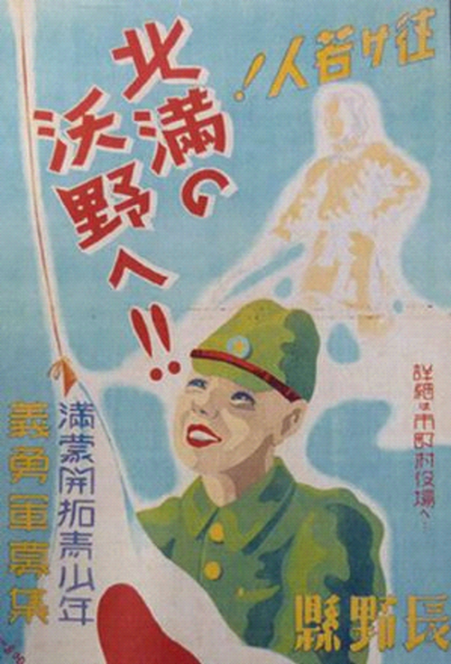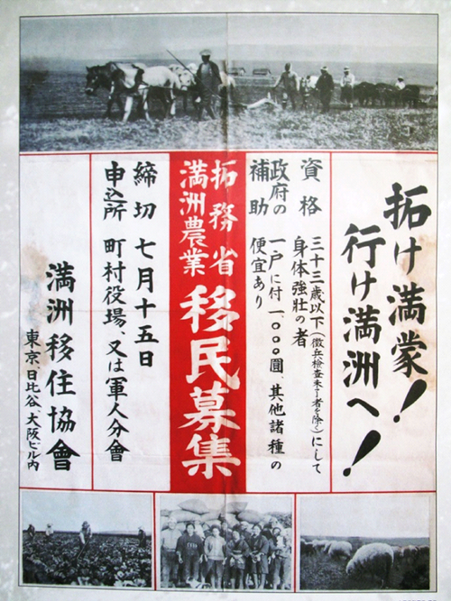「満蒙開拓団」とは1931年(昭和6年)の満州事変以降、1945年(昭和20年)の太平洋戦争敗戦までの期間に大日本帝国政府の国策によって推進された、中国大陸の旧満州、内蒙古、華北に入植した日本人移民の総称である。932年(昭和7年)から大陸政策の要として、また昭和恐慌下の農村更生策の一つとして遂行され、14年間で27万人が移住したという。開拓団は農業従事者を中心に、村落や集落などの地縁関係に重点をおいた移民団(開拓団)が日本の各地で結成された。その募集ポスターには、『王道楽土』や『五族協和』などをスローガンが踊ります。