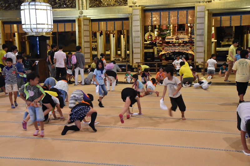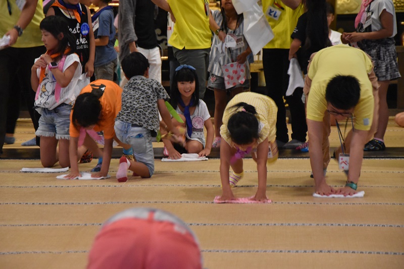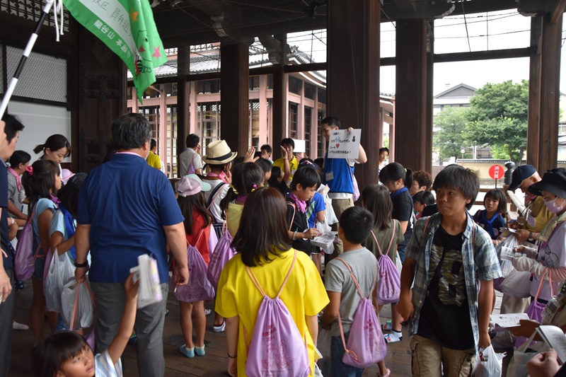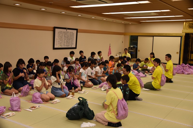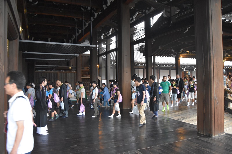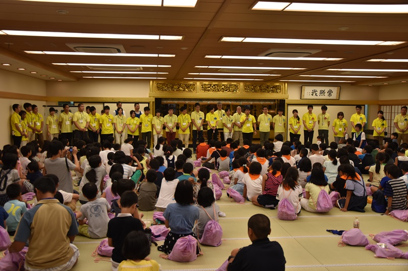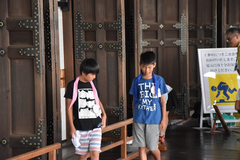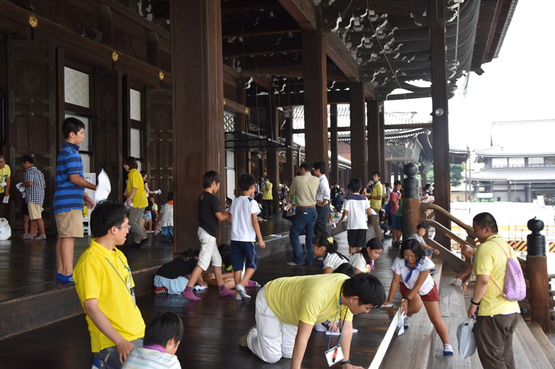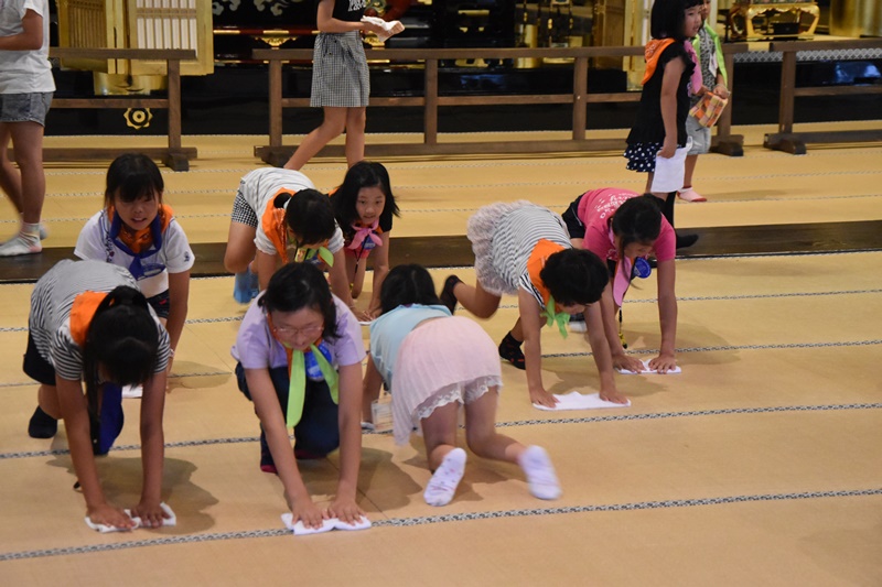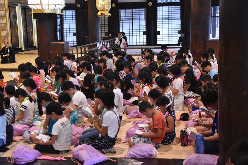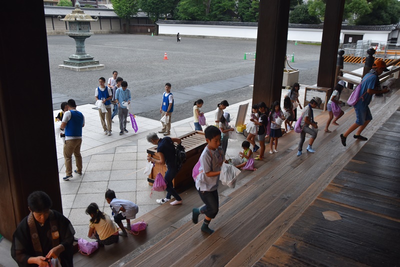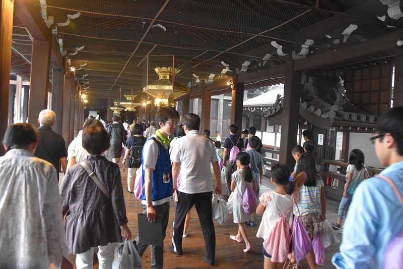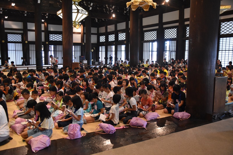 ■第1日目(7月25日) 午前7時15分御坊の島会館前を出発し、富安、日高中学前、そして有田南、有田北を回り、たくさんの友だちを乗せて、西本願寺に向かいました。バスの中では、みんなでクイズをしたり、バスの到着時間当てゲームをしたりして、あっという間に京都に到着しました。 京都に到着して、宿で荷物を下ろして安穏殿に行くと、2日間、私たちのお世話をしてくださるお兄さんとお姉さんが待っていてくれました。今回のしおりや筆記用具などが入ったリュックをもらい、一緒にお弁当をいただきました。 午後12時45分になると本日の日程説明を受けたり、各奉仕団の自己紹介をしたりしました。その後、御影堂に移動して午後2時からの開会式に参加しました。開会式の後は、御影堂の畳と廊下の雑巾がけを行いました。掃除後は、龍の子探検隊として、境内や書院、飛雲閣をまわり、各所で出題されるクイズを楽しみました。普段は入れない処に入れるのも児童念仏奉仕団に参加した特権です。 その後、安隠殿に戻り、ご法話を聞き、1日目の予定が終了しました。宿に戻って豪華な夕食を頂きました。夕食後は、京都タワーに登り、お土産を買ったりして、京都を満喫しました。 |