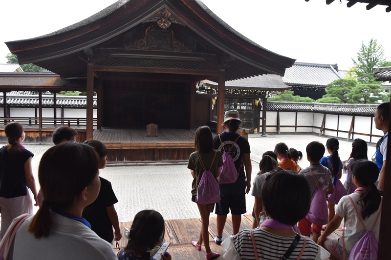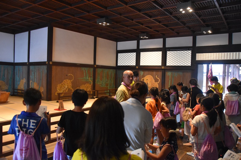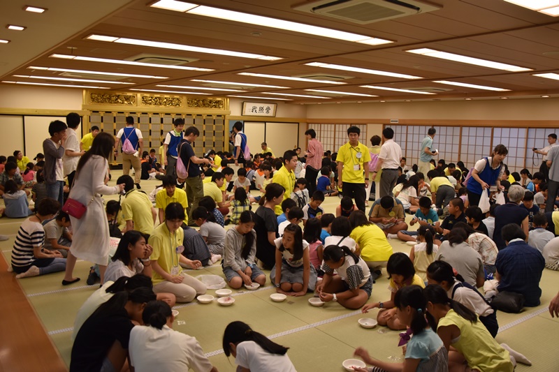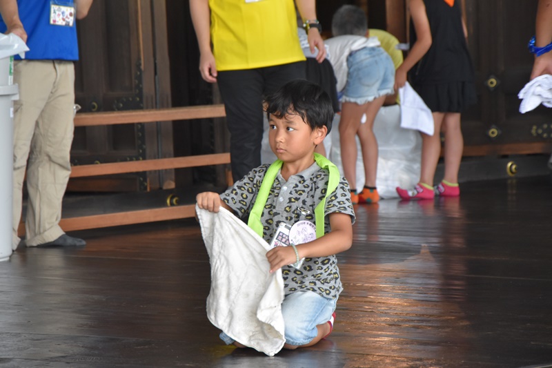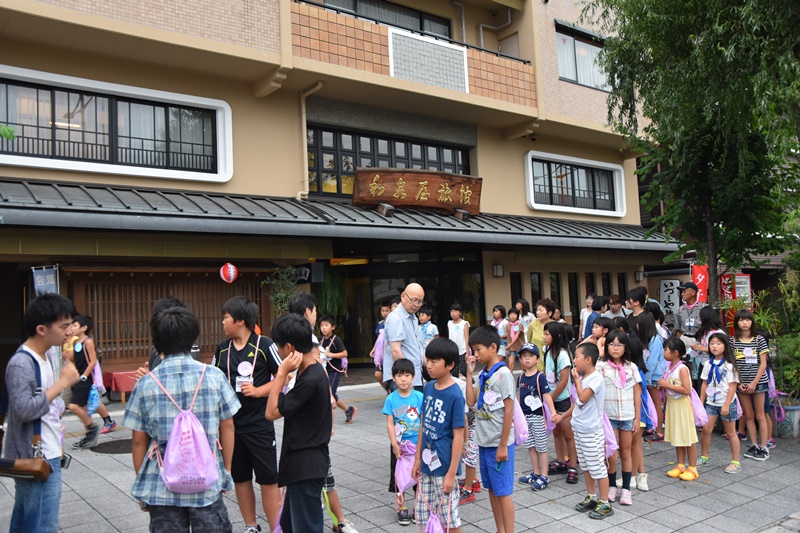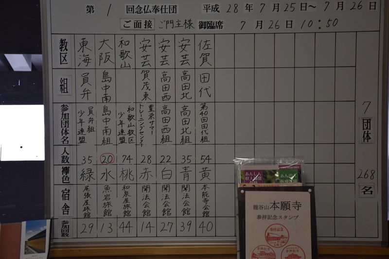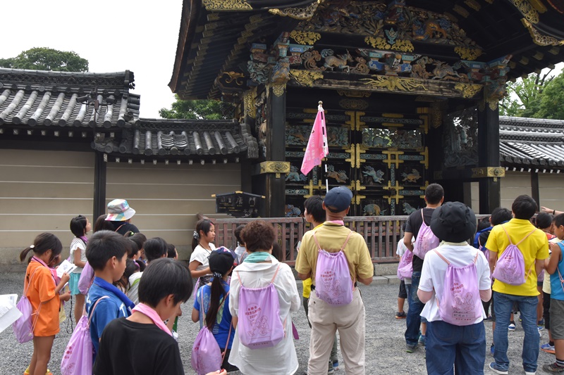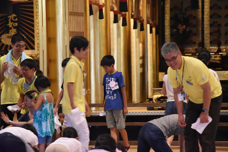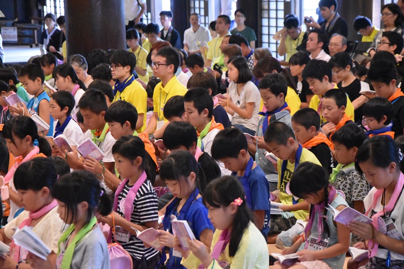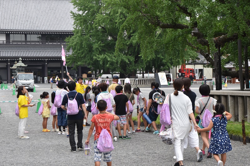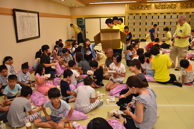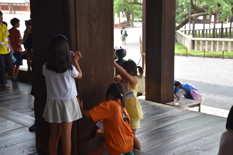 ■第1日目(7月25日) 午前7時15分御坊の島会館前を出発し、富安、日高中学前、そして有田南、有田北を回り、たくさんの友だちを乗せて、西本願寺に向かいました。バスの中では、みんなでクイズをしたり、バスの到着時間当てゲームをしたりして、あっという間に京都に到着しました。 京都に到着して、宿で荷物を下ろして安穏殿に行くと、2日間、私たちのお世話をしてくださるお兄さんとお姉さんが待っていてくれました。今回のしおりや筆記用具などが入ったリュックをもらい、一緒にお弁当をいただきました。 午後12時45分になると本日の日程説明を受けたり、各奉仕団の自己紹介をしたりしました。その後、御影堂に移動して午後2時からの開会式に参加しました。開会式の後は、御影堂の畳と廊下の雑巾がけを行いました。掃除後は、龍の子探検隊として、境内や書院、飛雲閣をまわり、各所で出題されるクイズを楽しみました。普段は入れない処に入れるのも児童念仏奉仕団に参加した特権です。 その後、安隠殿に戻り、ご法話を聞き、1日目の予定が終了しました。宿に戻って豪華な夕食を頂きました。夕食後は、京都タワーに登り、お土産を買ったりして、京都を満喫しました。 |