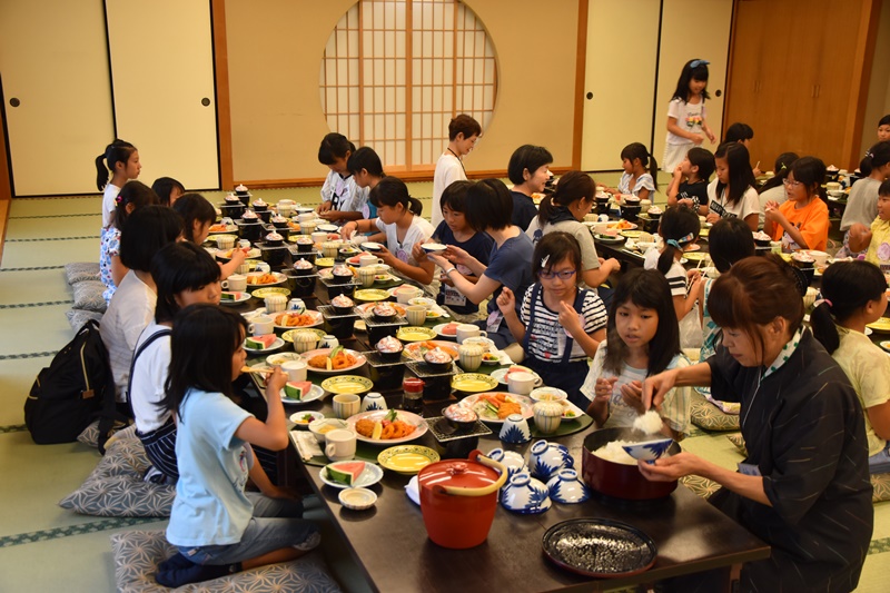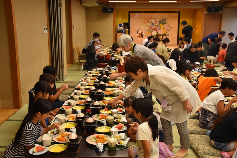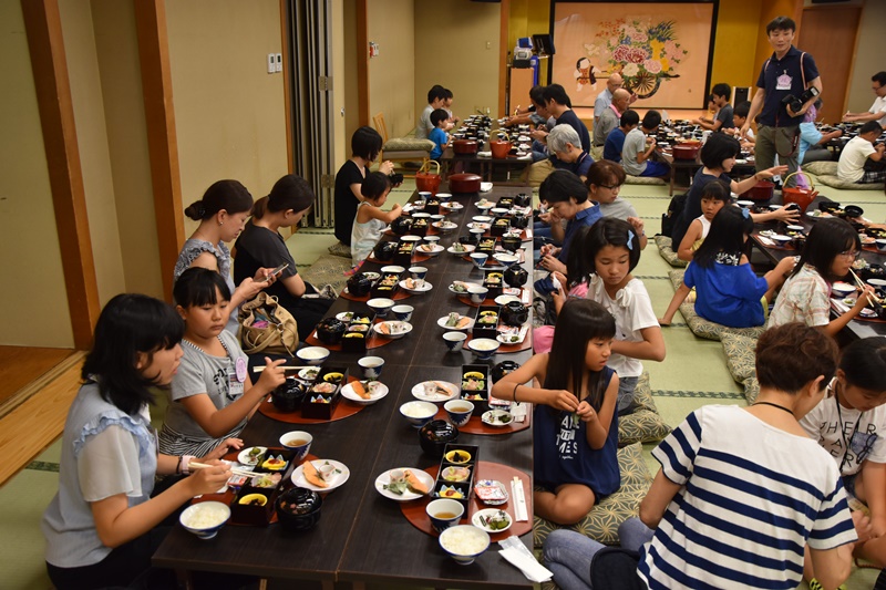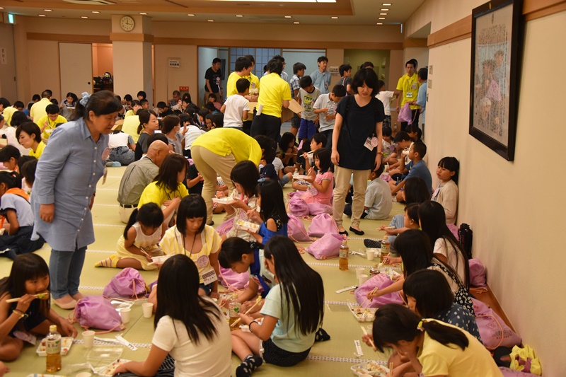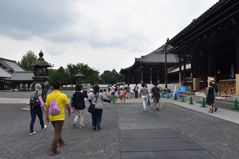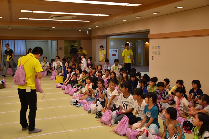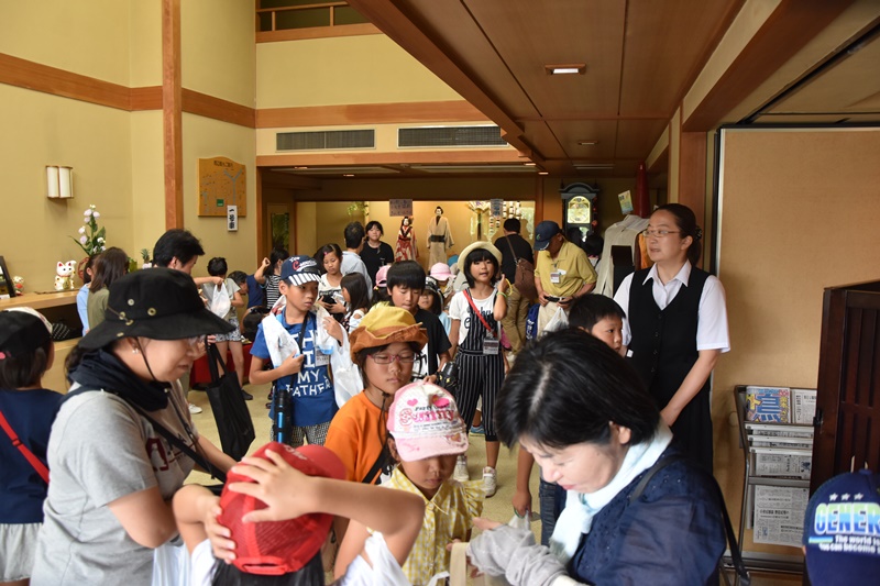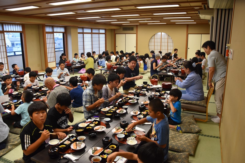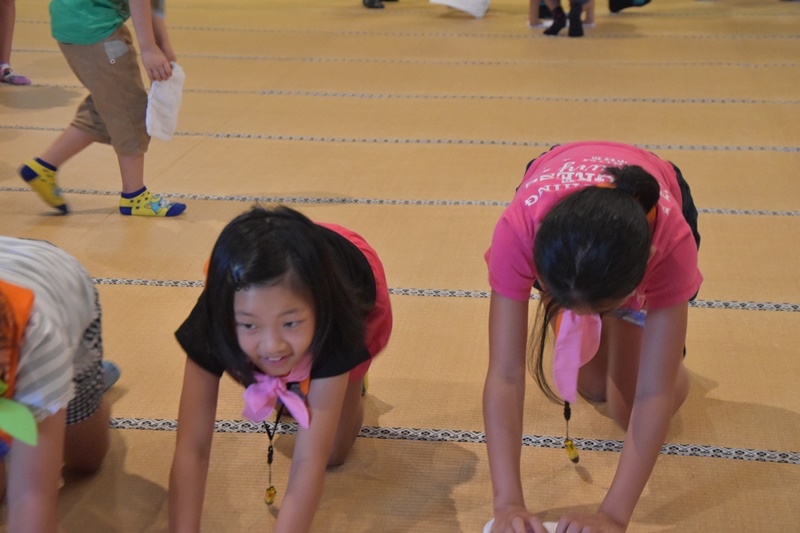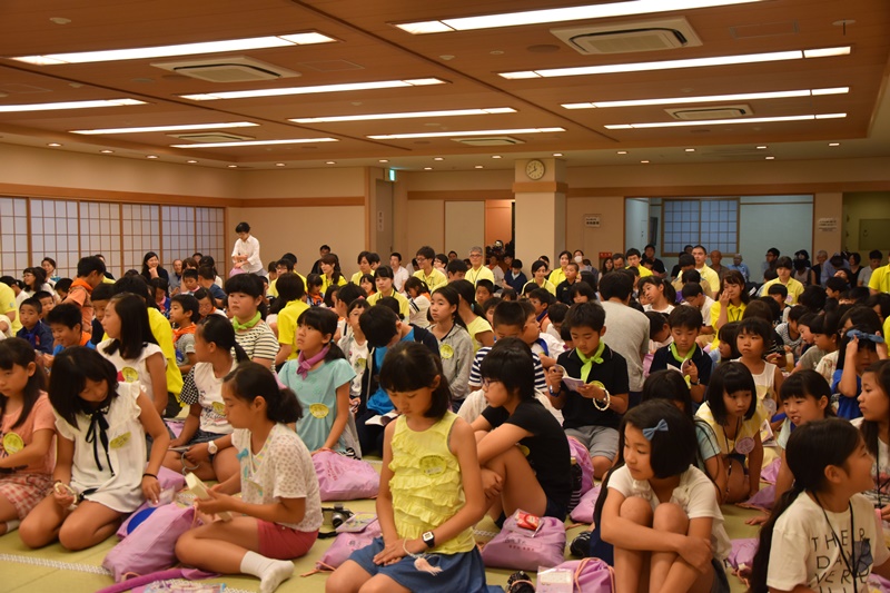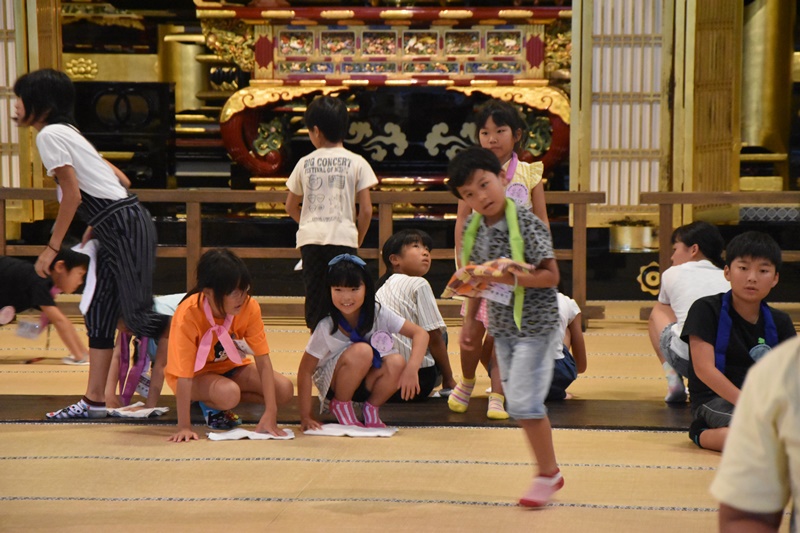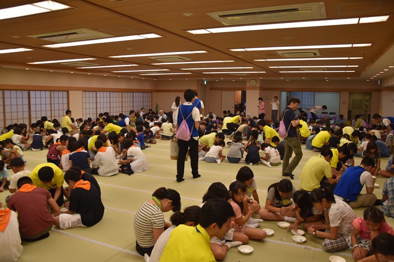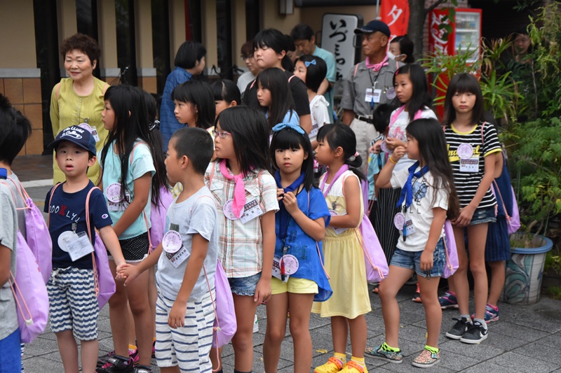 ■第1日目(7月25日) 午前7時15分御坊の島会館前を出発し、富安、日高中学前、そして有田南、有田北を回り、たくさんの友だちを乗せて、西本願寺に向かいました。バスの中では、みんなでクイズをしたり、バスの到着時間当てゲームをしたりして、あっという間に京都に到着しました。 京都に到着して、宿で荷物を下ろして安穏殿に行くと、2日間、私たちのお世話をしてくださるお兄さんとお姉さんが待っていてくれました。今回のしおりや筆記用具などが入ったリュックをもらい、一緒にお弁当をいただきました。 午後12時45分になると本日の日程説明を受けたり、各奉仕団の自己紹介をしたりしました。その後、御影堂に移動して午後2時からの開会式に参加しました。開会式の後は、御影堂の畳と廊下の雑巾がけを行いました。掃除後は、龍の子探検隊として、境内や書院、飛雲閣をまわり、各所で出題されるクイズを楽しみました。普段は入れない処に入れるのも児童念仏奉仕団に参加した特権です。 その後、安隠殿に戻り、ご法話を聞き、1日目の予定が終了しました。宿に戻って豪華な夕食を頂きました。夕食後は、京都タワーに登り、お土産を買ったりして、京都を満喫しました。 |