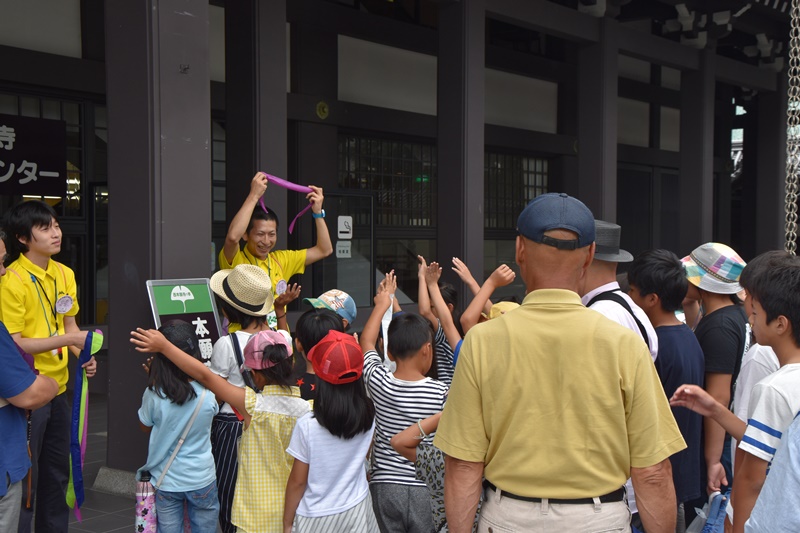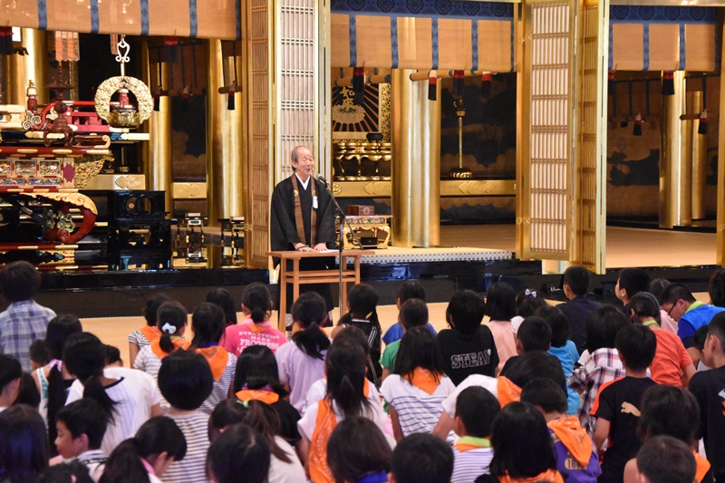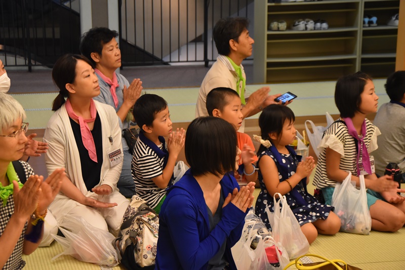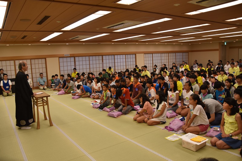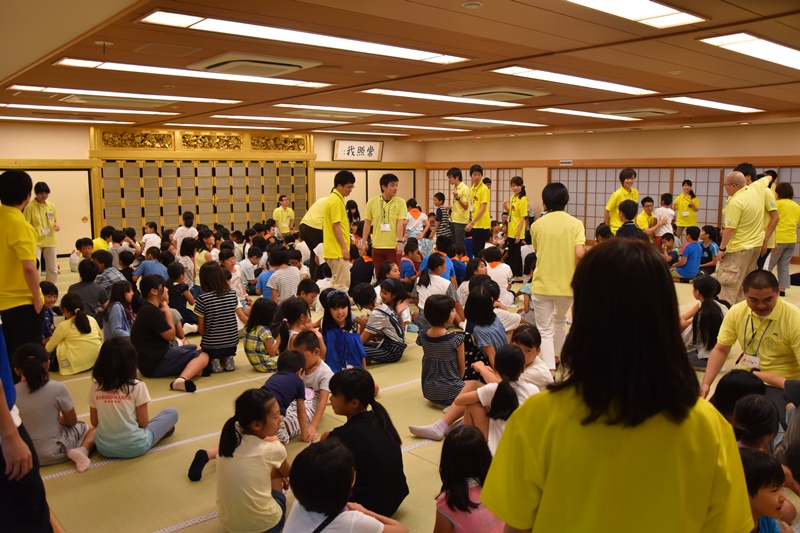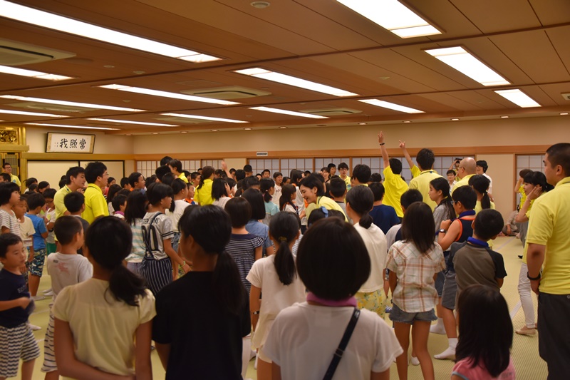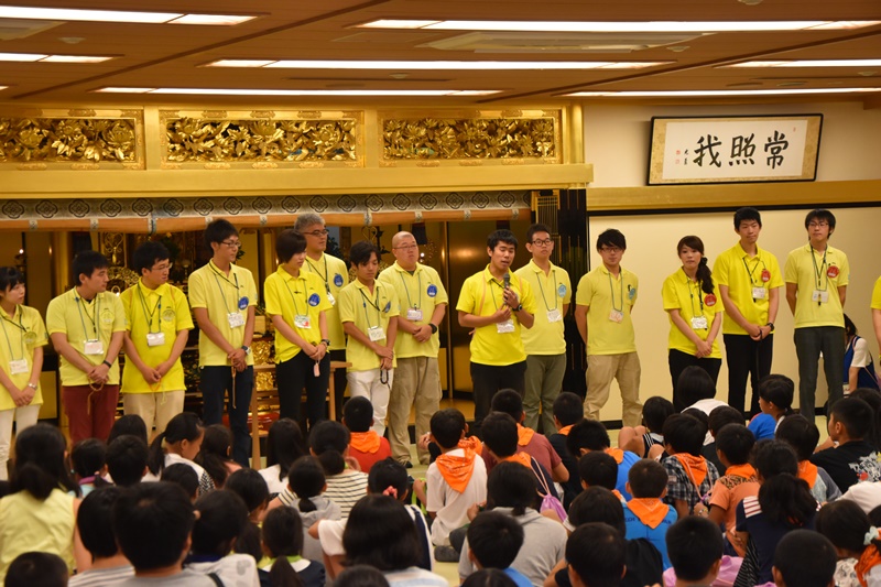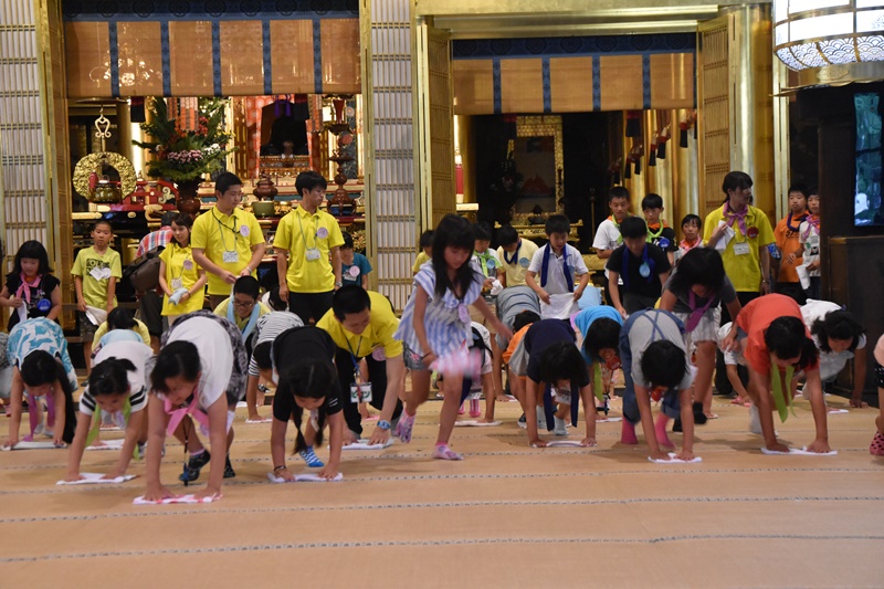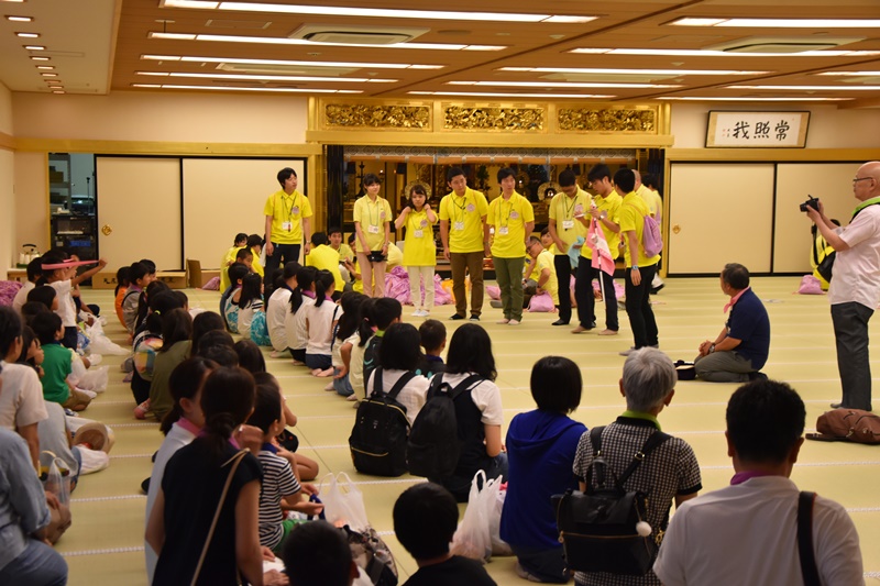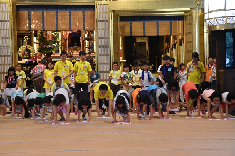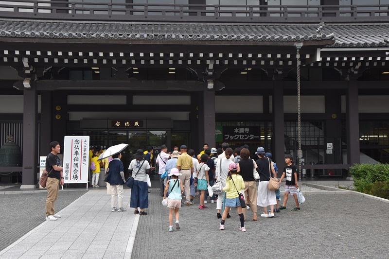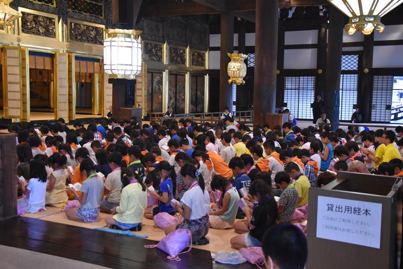 ■第2日目(7月26日) 起床は朝5時です。今回の念仏奉仕団で最大の試練でした。眠い目をこすりながら6時からのお晨朝に参拝しました。約1時間のお勤めでしたが、みんながんばって最後まで乗り切りました。 お晨朝が終わると、宿に戻って朝ごはんを頂きました。午前9時から安穏殿で2日目の予定がスタートです。まずは、お兄さん、お姉さんと一緒にゲームをしました。そのままお念珠作りをおこないました。すぐにできるお友達もいれば、なかなかできないお友達もいましたが、みんな楽しそうにお念珠を作っていました。そしてその後は、今回の念仏奉仕団で一番のイベントであるご門主さまとの記念撮影がありました。御影堂の向拝の階段に乗車バスごとに整列しご門主さまがおでましになるのをお待ちしました。ご門主さまがお出ましになると、2号車のバスを代表して三原涼雅くんと松本遥人くんが挨拶をしました。記念撮影が終わるとご門主さまから直接お言葉を頂くことができました。 その後、安穏殿に戻り終了式です。本願寺の方から和歌山の子ども達を代表して田中智佳さんが感謝状を頂きました。これで、昨日のお昼から始まった念仏奉仕団もあっと言う間に終了となってしまいました。お昼のお弁当を食べた後は、京都市水族館に行きました。イルカショーをみたり、ゾウガメと触れ合ったり、アザラシやペンギンを間近にみたりして大興奮の京都旅行でした。 1年ぶりに会えたお友達もいたし、新しいお友達もできたし、夏の思い出がいっぱいできた2日間となりました。 |