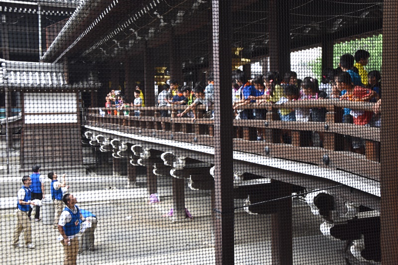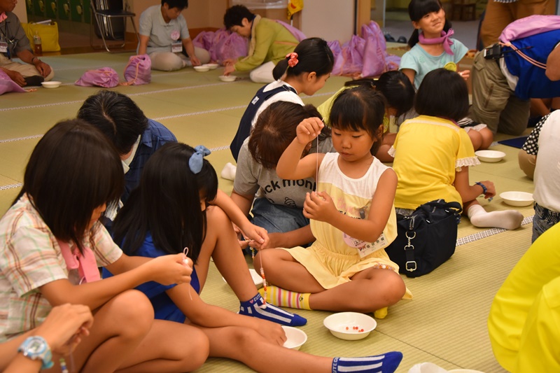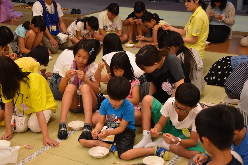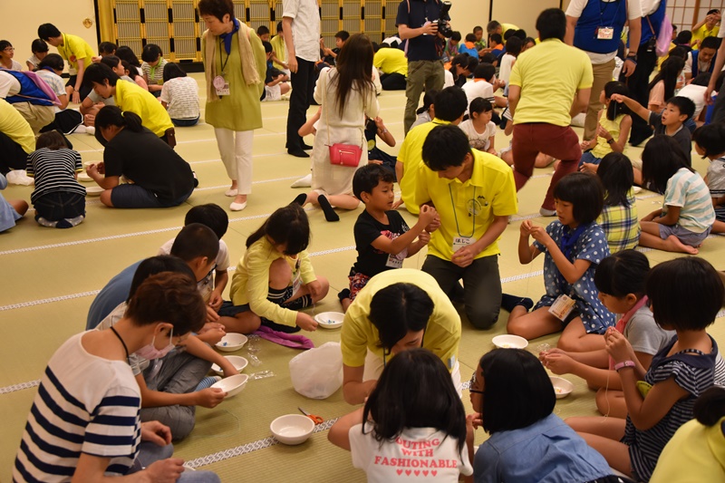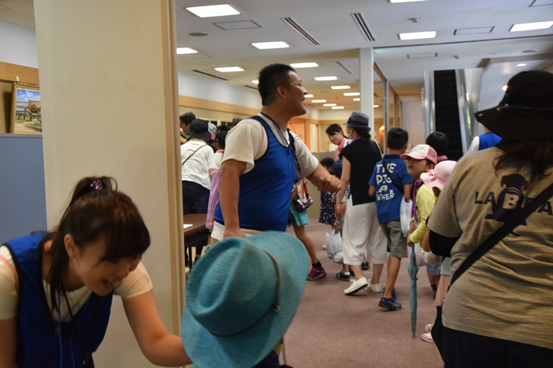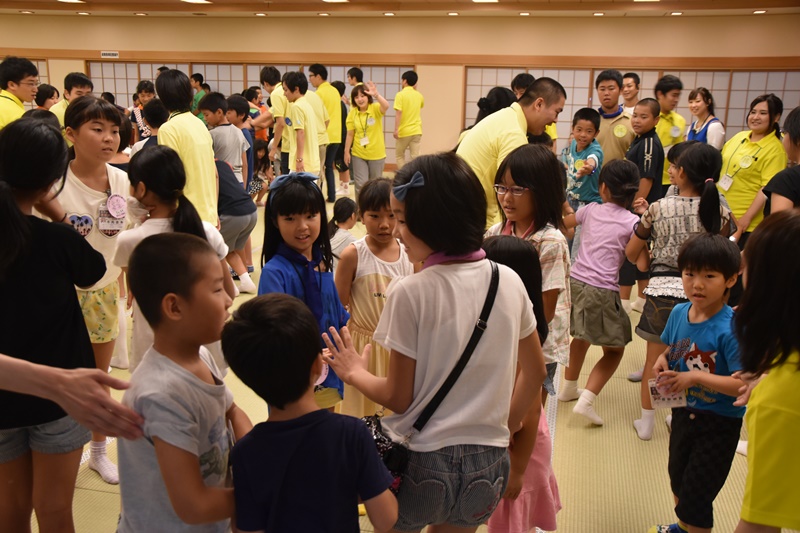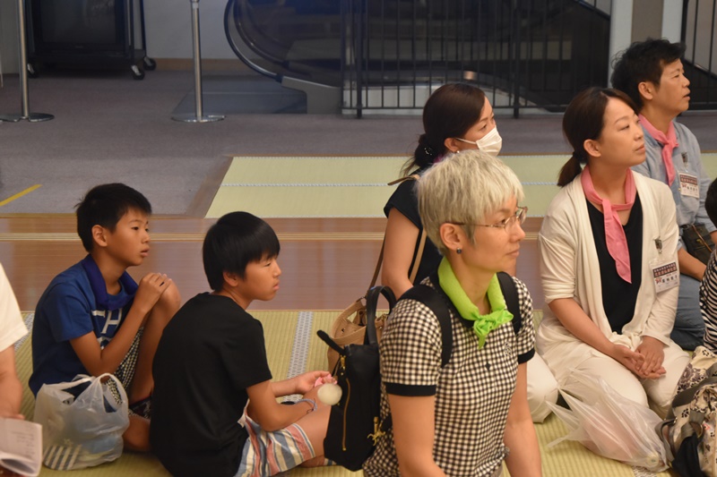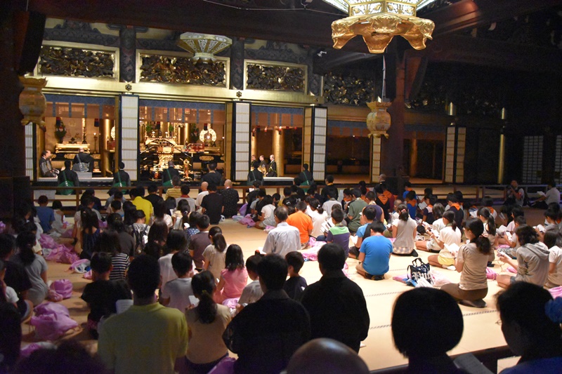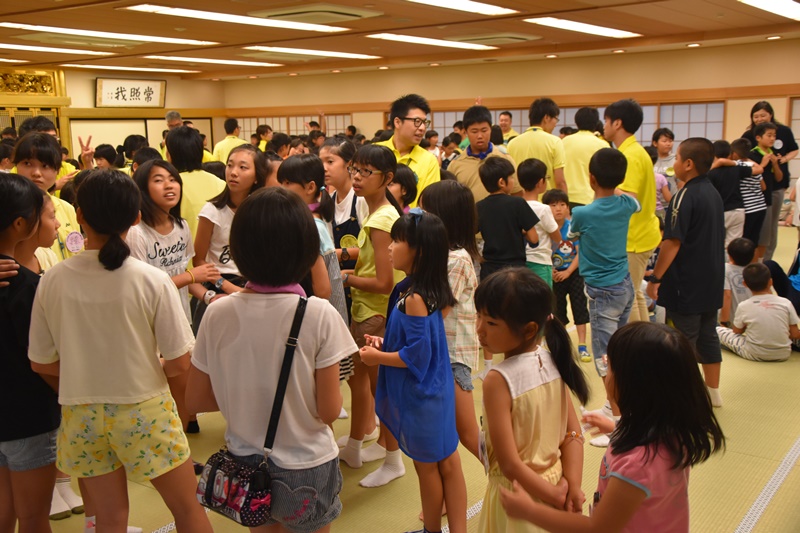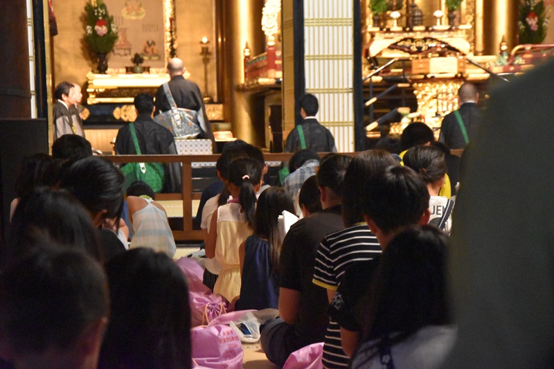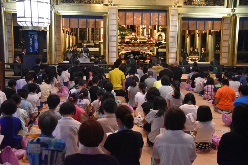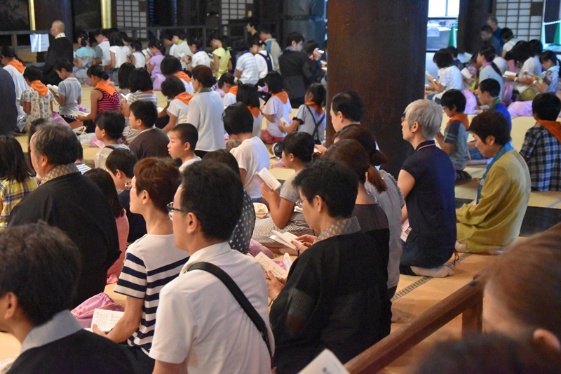 ■第2日目(7月26日) 起床は朝5時です。今回の念仏奉仕団で最大の試練でした。眠い目をこすりながら6時からのお晨朝に参拝しました。約1時間のお勤めでしたが、みんながんばって最後まで乗り切りました。 お晨朝が終わると、宿に戻って朝ごはんを頂きました。午前9時から安穏殿で2日目の予定がスタートです。まずは、お兄さん、お姉さんと一緒にゲームをしました。そのままお念珠作りをおこないました。すぐにできるお友達もいれば、なかなかできないお友達もいましたが、みんな楽しそうにお念珠を作っていました。そしてその後は、今回の念仏奉仕団で一番のイベントであるご門主さまとの記念撮影がありました。御影堂の向拝の階段に乗車バスごとに整列しご門主さまがおでましになるのをお待ちしました。ご門主さまがお出ましになると、2号車のバスを代表して三原涼雅くんと松本遥人くんが挨拶をしました。記念撮影が終わるとご門主さまから直接お言葉を頂くことができました。 その後、安穏殿に戻り終了式です。本願寺の方から和歌山の子ども達を代表して田中智佳さんが感謝状を頂きました。これで、昨日のお昼から始まった念仏奉仕団もあっと言う間に終了となってしまいました。お昼のお弁当を食べた後は、京都市水族館に行きました。イルカショーをみたり、ゾウガメと触れ合ったり、アザラシやペンギンを間近にみたりして大興奮の京都旅行でした。 1年ぶりに会えたお友達もいたし、新しいお友達もできたし、夏の思い出がいっぱいできた2日間となりました。 |