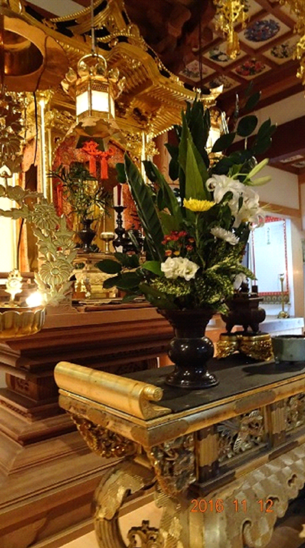 先日、南塩屋光専寺の御住職柏木秀憲氏に代用仏具のことをお聞きしたら、「私方には燭台、香炉、仏飯器がありますよ、花瓶も確かにあったと思いますが、しまいこんでしまっています。仏飯器は今も普段には使用していますよ。」とのこと、早速見せていただきましたが、写真のように全くキズもなく大切に扱われています。氏から「確か、野口の安楽寺さんでも普段使われているように思います。」と教えてくださいました。早速、お訪ねしますと、陶器製の黒光する花瓶、燭台、仏飯器が現にお荘厳に使用されていました。報恩講時は殆どが宣徳製や真鍮製のものになっていますが、蓮師前では花瓶、燭台が現役でした。(写真の女性は伊藤明子住職)