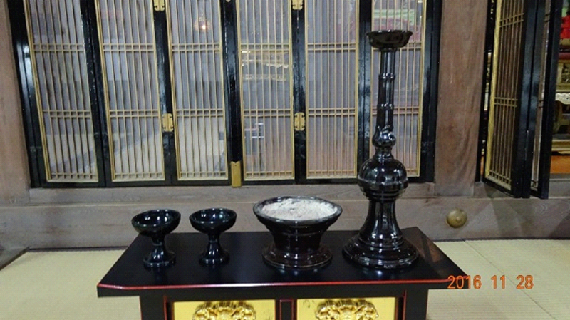 私の自坊三宝寺に焦げ茶色(殆ど黒色に見える)の陶器製の本堂前卓用の花瓶一対があり、常の荘厳に使用しています。(右の写真) 祖父母から「戦時中、金属製の仏具はみな供出させられた。これはその代わりくれたもの」と聞いていました。私が子どのころには黒い仏飯器も1対あったような気がしますが、今はありません。燭台や香炉の代用品があったという記憶はありません。 |