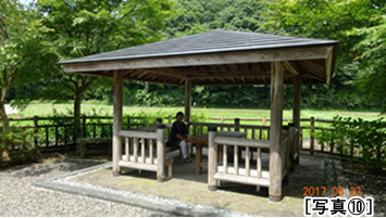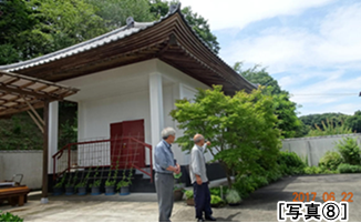 ご住職からは、東日本大震災の爪痕が残る「願入寺(聖人の孫、如信上人開基)」や「枕石寺」の現状もお聞かせいただいた。帰り際、宝物館も案内していただき、聖人の真筆と伝えられる断簡や弁円が所持していたという短刀などの宝物を拝観させていただいた。[写真G]また、近くに明法房の墓とされる「明法房の塚」があることを教えていただき、そこにも無事参拝を果たすことができました。墓は深い木立の中にあり、苔むす参道を含め静謐な空間となっています。[写真H]今、周辺は公園としてよく整備されお瀟洒な四阿(あずまや)まで建てられていました。[写真I]ただ、寺からの遊歩道を少し歩いてみましたが、イノシシの足跡がくっきり、はっきり、いっぱいあります。クワバラクワバラ。駐車場の隣にはご住職が植栽・管理されている梅林がありますが、その周りの白いフェンスは獣害を防ぐためとか。山里は何処も大変です。