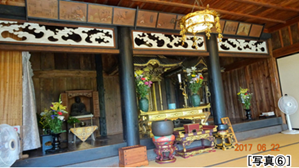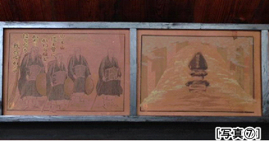 本堂前でお参りしていると、ご住職が現れ、本堂に招き入れて下さいました。坊守さままでお出まし下さり、本堂に敷設されている広間でお茶の接待まで受けることとなりました。まったく恐縮の至り。[写真D]そこでご住職の本多隆海師より法専寺さまの縁起をじっくり伺いました。法専寺さまは現在、真宗大谷派に属され、開基まもなく八百年になろうかという古刹、ご住職は当山第29世となるとのこと。本堂の形態は親鸞聖人がいらした当時の道場形式のままであった。外陣より内陣に向かって本間右脇壇上に親鸞聖人の御木像が、左脇壇上には開基明法房の御木像が安置されています。 法専寺さまの本堂は他の由緒寺院に比べると、大変こぢんまりとしており、本堂内の天井も低い。ご住職の御説明によると、かつては大きな本堂であったが、災害にあい本堂が大きく傷んだため、それを解体、用材を少し切り詰めて再利用して建立されたとのこと。 本堂に入り、すぐ気づくのは外陣正面欄間の上に掲げられた「御絵伝」です。勿論「弁円済度」の場面です。これを何枚もの絵にして、この劇的な回心の逸話が理解できるように配置されています。これはなんと現住職の御祖父様が描かれたものだそうです。[写真EF]このお方は大変利巧な方のようで、今宝物館に展示されている竹を駆使して製作された御仏壇も見事です。