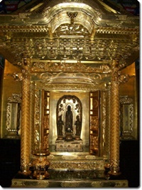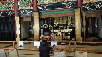 昨年1月、二十四輩巡りの一貫として実際に行ってみると真岡市高田は栃木県旧芳賀郡二宮町は西念寺のある茨城県笠間市稲田からはそう遠くはありませんでした。本寺専修寺の広い境内に特色ある諸堂が並びます。総門、楼門をくぐると目に映るのは「如来堂」、東向きの本堂はあまり大きくはありませんが、屋根は正面に千鳥破風をのせ、その前に一間の向拝が設置されています。真宗本堂の形としては独特です。堂内に入ると、内陣中央にご本尊「一光三尊仏」の「お前立ち」が安置されています。御本尊は秘仏です。17年に一度御開扉になり、一身田の本山では2014年4月から2016年3月まで日を区切って公開されました。私には、次の17年後はありませんので、2015年4月5日に門徒推進員の細谷廣延氏を誘って、に高田本山にお参りしてきました。その時の様子や「一光三尊仏」についてはこのHP「雑色雑光」(H27.5)に氏が詳しくレポートしてくれています。