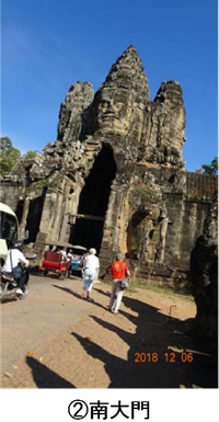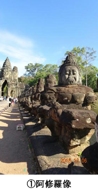 今回のカンボジア訪問はシェムリアップ(カンボジアの北西部分)という地域限定で、そこにアンコール・ワットはあるのでした。でも最初に訪れたのはアンコール・トムというところ。アンコールとは「都」を意味し、トムは「大きい」を意味するとガイドさんに教えて頂きましたが、このアンコール・トムはとっても広い遺跡で(勿論世界遺産)一辺3kmの正方形の広さがあるとのことでした。(アンコール・ワットのほぼ4倍。因みにワットの意味は寺院です。)入り口は5カ所あるのですが、私達はほとんどの人がここから入るという南大門から歩いて入りました。南大門の入り口にたどり着くまでには沢山の阿修羅像と蛇神が並び待ち受けてくれていました。@