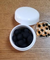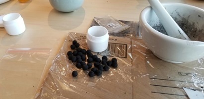 これで正露丸のできあがり〜? ・・・・ではなかった 『練り香』のできあがりです。 (実は正露丸を連想して頂くとホントに実物感があるのです。それほどよく似ています) 今回、作り始めるまでは少々難しいのではと危惧していたのですが、玉初堂のイケメンさん(済みません名前を失念してしまいました)のご指導よろしきを得て実に簡単に練香が出来上がりました。素晴らしいマイ練香です。でも長期の保存は難しいと承りましたので(現在は小さな容器に密閉し冷蔵庫保存をしています。2年間位は保つらしい) ゆったりまったりした折り、このマイ練香を焚き、雅な非日常生活を味わいたいものと思っています。