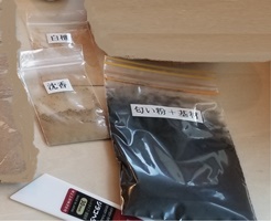 ではこれから作り方を見て頂きましょう。 材料は 黒い匂い粉の基材+白檀+沈香+蜂蜜+お湯 です。