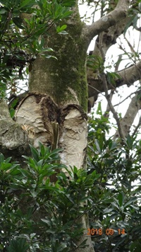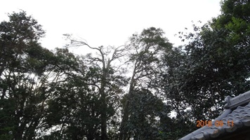 昨年9月始め近畿地方を襲った台風21号、当地にも甚大な被害をもたらしました。幸い三宝寺の被害は軽微で、山門の装飾瓦が一部損壊した程度で済みました。しかし、一本の木の頑張りが無かったら、手洗い処(「漱浄舎」と名付けています)が大被害を受けるところでした。当日は南東からの暴風がすさまじく、境内を取り囲む木々が倒れ、枝が折れ建物を襲いました。最も危うかったのはクロガネモチの巨大な枝、地上20mくらいのところで折れた枝元の直径は70cm、長さ8mくらい。それが折れて落下というより吹き飛んできました。その様子を雨戸の隙間から見ていましたが、「これはアカン、『漱浄舎』がつぶれた!」と覚悟しました。