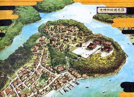 京から偉い坊さんが来たというので、各地から大勢の人々が参拝に訪れ、門前には多屋とよばれた宿坊が軒を連ねる一大宗教都市と発展しました。そこに集まる人々の結集は、やがて支配者に反抗する力となりました。いわゆる一向一揆です。上人はこれを静めようとしましたが、効果なく、身の危険を感じた上人は、ひそかに船で吉崎を離れました。文明七年(一四七五年)吉崎滞在はわずか四年余りでした。その後は、御坊を訪ねる者は少なくなり、大宗教都市は蜃気楼のように消滅していきました。