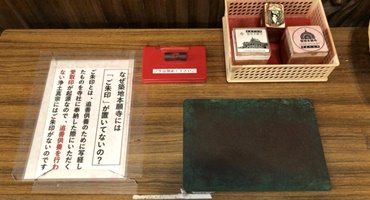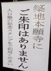 ご門徒さんにもよく聞かれることですが、「真宗の寺には御朱印がないのですか。」と。昨年11月、築地本願寺の報恩講にお参りした時、本堂でのお勤めの最中ですが、賑やかなおばさんたちが入ってきました「御朱印はどこで頂けるの」と布袍輪袈裟の職員に尋ねています。「ここには御朱印はありません。そこにスタンプがありますので、どぞう参拝記念に押して行ってください」と答え、数種類のスタンプが並んだ机の前まで案内していました。「 スタンプってなんかちょっと頼りないわね。」と少し「不満」を漏らしながら朱印帖のようなものにそれらを押して、さっさと出て行かれました。(写真はこの日築地本願寺に用意されていたスタンプ)