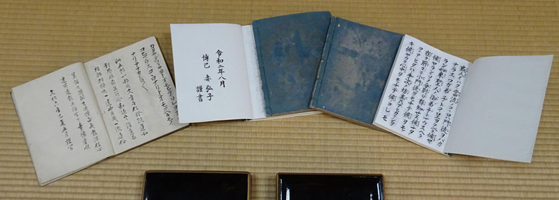 K氏の四十九日法要の折、奥様弘子さんが私にこう仰って下さいました。 「失ったままになっている一帖と四帖、私が書かせていただいてもかまいませんか。」 弘子様は書道の心得があり、近所の子供たちに習字を教えておられます。なんと有難いことでしょうか。 もちろん私は大賛成。底本として三宝寺所蔵の寂如上人本と准如上人本を使って頂くことにしました。弘子さんの完成目標は12月に予定しているご主人の一周忌です。 弘子様はそれから、ご自身の書道の師である有田市糸我得生寺のご住職からアドバイスを頂き、他の帖に近い料紙や墨を調達されて書き始められました。実に丁寧に書写されてゆきました。 昨年夏にはほぼ完成、私に校合が任されましたが、誤りは皆無。素晴らしい1・4帖が仕上がりました。深緑色のやわらかい表紙を和綴じした見事なご文章、二百年ぶりの「五帖一部」の復活です。