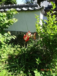 毎年6月上旬、境内の小さな花壇に大輪のアマリリスが数株咲いてくれます。花壇といっても全く手入れがされておらず、雑草、雑木に埋もれて申し訳ないことになっています。