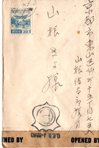 半年ほど前、母の実家(京都市)に住む、従兄の奥様から戦没した母の弟の遺品類が贈られてきました。その中の手紙の1通に GHQによって開封されたことを示すスタンプとテープが貼ったものがありました。宛名の「山根きよ」は母の母、私の祖母です。