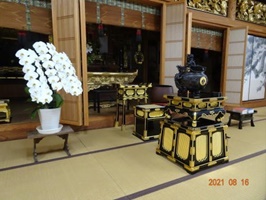 今年のお盆は、雨雨雨でお参りに行くのも、寺にお越しいただくのも大変なことでした。三宝寺の本堂には、毎年お盆と正月には、「美浜オーキッド」を経営されているご門徒のH氏から見事なコチョウランがお供えされます。また、U氏からは外陣香炉の余台が寄進され、本尊前でのお焼香がとても楽になりました。 まだまだ暑さが続きますが、どうかみなさま、コロナに気を付けお念仏の生活に励まれますよう念じております。 南無阿弥陀仏 南無阿弥陀仏 入山三宝寺住職 湯川逸紀 |