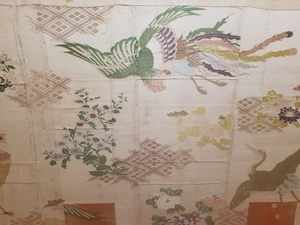 因みにこれ程までにこの七條を蘇らせたいと思ったことには訳があります。この七條にはどういうことでか山寺の家紋が金糸で織り込まれているのです。意匠としてのデザインか、はたまた別あつらえとしての七條かは定かではないのですが、「この七條は大切にせぇよ」との言い伝えがありました。その言い伝えによりこうして山寺の寺宝が蘇ったのです。早速、2月15日の「小よりサロン」の折、参拝された皆様にお披露目致しました。