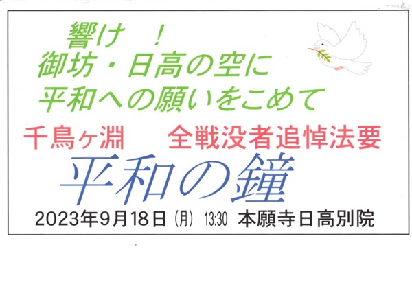 また、私どもの寺の御門徒で日高町小中在住のS氏(当時小学生)の証言では、昭和20年、当地でも空襲が頻繁にあったころ、40代の後半であったお父さんが毎日のように西山での「豪堀り」に動員されたと語っています。今夏、日高町9条の会が開催した戦争資料展に、戦時中の過酷な思い出として和田国民学校低学年の時、この銃座造りのための資材としての砂利をおうこで担って運んだ様子が詳細に書かれているものがありました。まさに国民総動員、幸い米軍の上陸がなかったものの、もし、ここから上陸してきたら、日高平野全体が戦場化、沖縄戦のような様相が現実になったことでしょう。西山、入山、丸山、野口に多く掘られた地下壕が果たして米軍の侵入を食い止めることができたでしょうか。疲弊しきった日本の軍隊があの強大な米軍に対抗できるとは思えません。住民を巻き込んだゲリラ戦のなかで多くの「いのち」が失われることは必至でありましょう。 響け!平和の鐘!御坊の空に! 毎年、本願寺教団は9月18日に、国立千鳥ヶ淵戦没者墓苑で「千鳥ヶ淵全戦没者追悼法要」を行っています。そしてそれにあわせて全国の寺院に「平和の鐘」として梵鐘や喚鐘を撞くよう呼びかけています。御坊組では、この日1:00に日高別院に集まり、1:30より東京の法要開始に合わせて大梵鐘を撞きます。なお、この日は、あの15年におよぶアジア・太平洋戦争の発端となった満州事変柳条湖事件(1931年)勃発の日です。 南無阿弥陀仏 南無阿弥陀仏 三宝寺住職 湯川逸紀